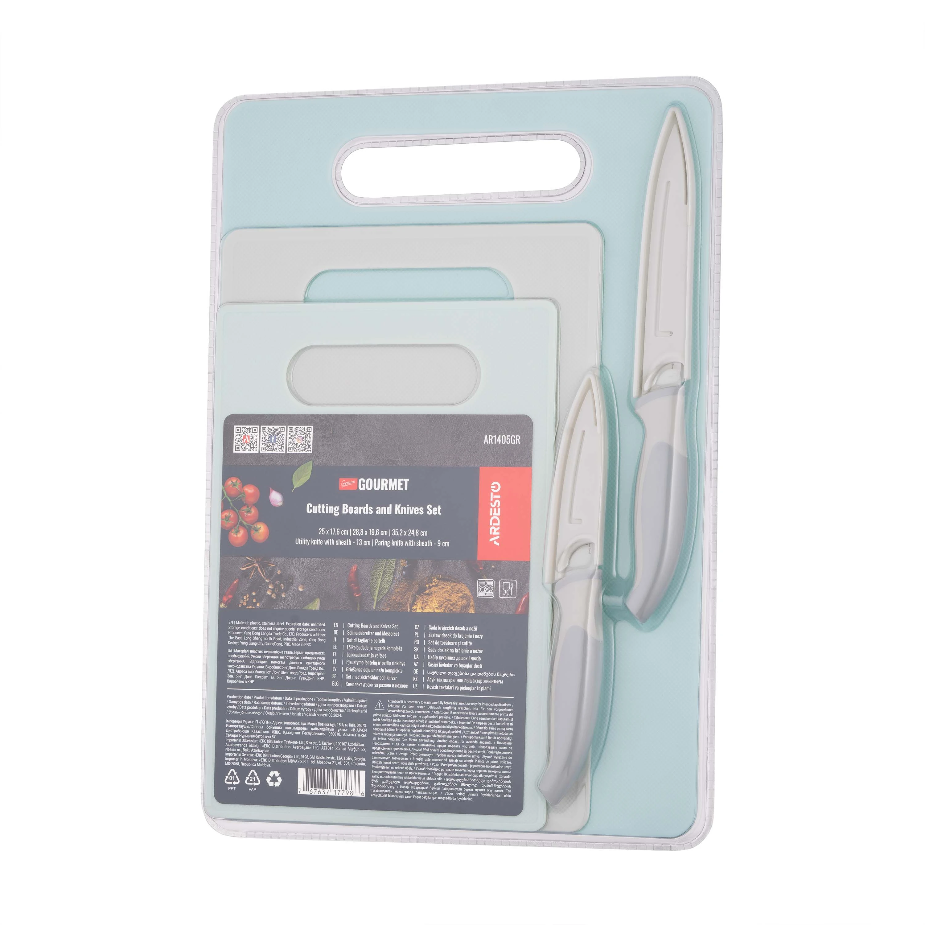 Набір ARDESTO Gemini Gourmet – ліпший вибір для стильних і практичних кухонь. Цей комплект складається з 5 предметів, зокрема трьох різних за розміром кухонних дошок і двох ножів, які виготовлено з нержавіючої сталі 3CR13. Дошки різного кольору – блакитний, сірий і тіффані – додадуть цікавих акцентів кухонному гарнітуру. Ножі мають леза завдовжки 8,9 см і 12,7 см, а пластикові руків’я гарантують зручний хват. Пластикові дошки можна безпечно мити в посудомийній машині, тоді як ножі потребують ручного догляду.
