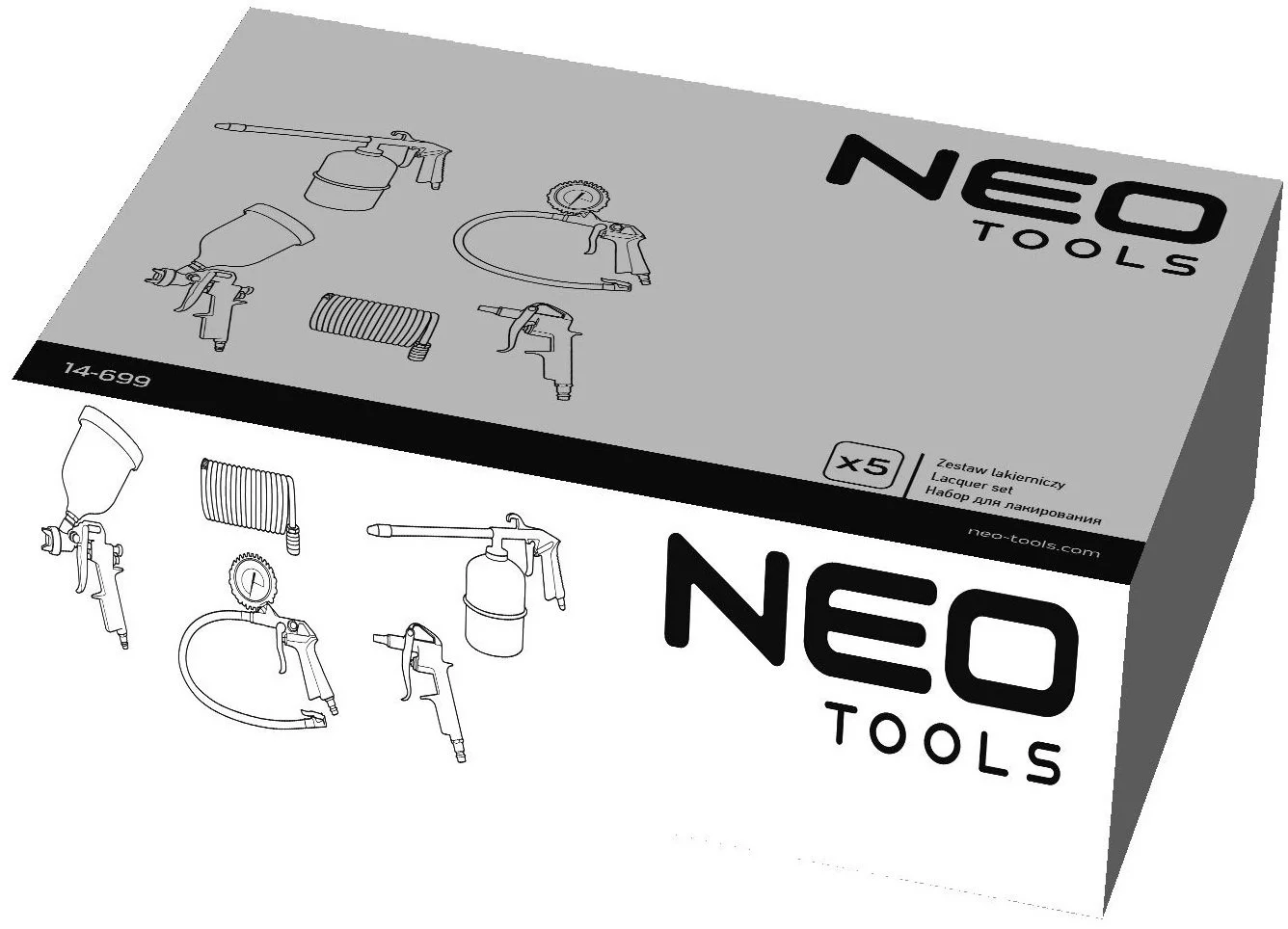 Набір фарбувальний NEO, 5шт., пістолет-розпилювач, пістолет для продування, пістолет з манометром, спіральний шланг. До його складу входять: пістолет-з верхнім резервуаром, пістолет розпилювач, пістолет для продування, пістолет для накачування шин з манометром та спіральний напірний шланг довжиною 5 м. Набір пропонує широкий спектр застосувань у майстерні, таких як фарбування, накачування або очищення поверхні Сертифікат CE підтверджує високу якість інструментів.