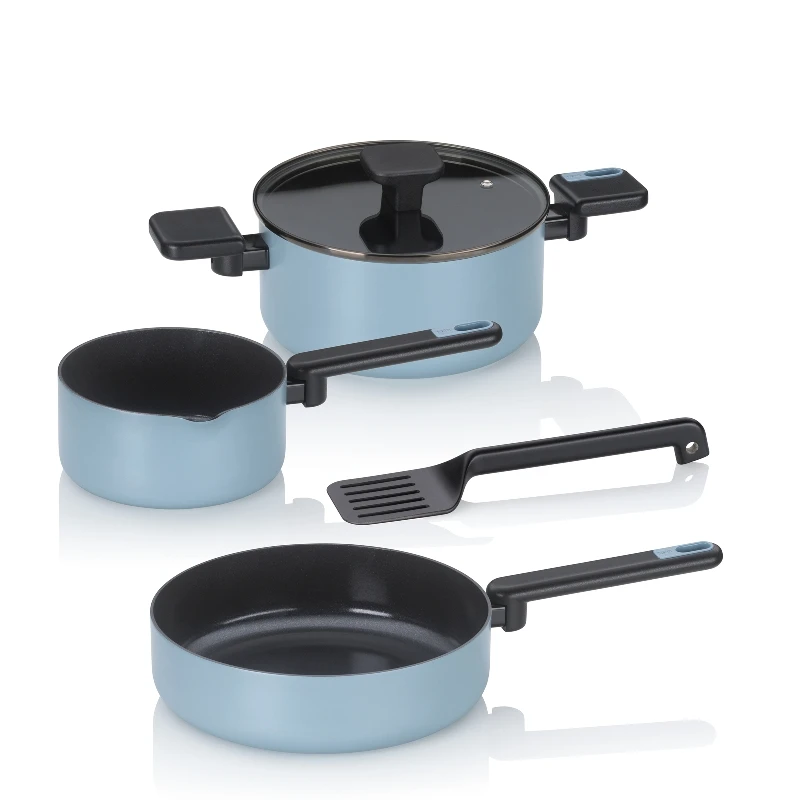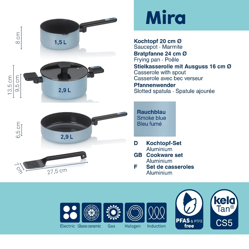 Набір посуду KELA Mira з алюмінію з керамічним покриттям виглядає стильно та елегантно. Цей набір посуду поєднує сучасний дизайн з високою функціональністю — він ідеально підходить для тих, хто цінує естетику та якість на кухні. Елегантна матова поверхня димчасто-синього кольору надасть вашій кухні стильного акценту.