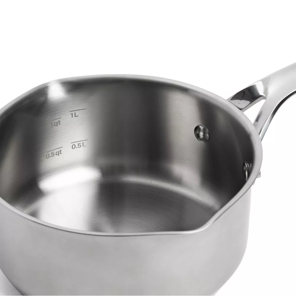 Індукційна основа з товстої нержавіючої сталі з алюмінієвим сердечником для швидкого та рівномірного нагрівання. Корпус з нержавіючої сталі з інкапсульованим дном для чудової теплопередачі. Вигнутий обідок для легкого наливання без крапель та зручна мірна шкала. Ручки з нержавіючої сталі, що залишаються холодними, для комфортного та надійного тримання.