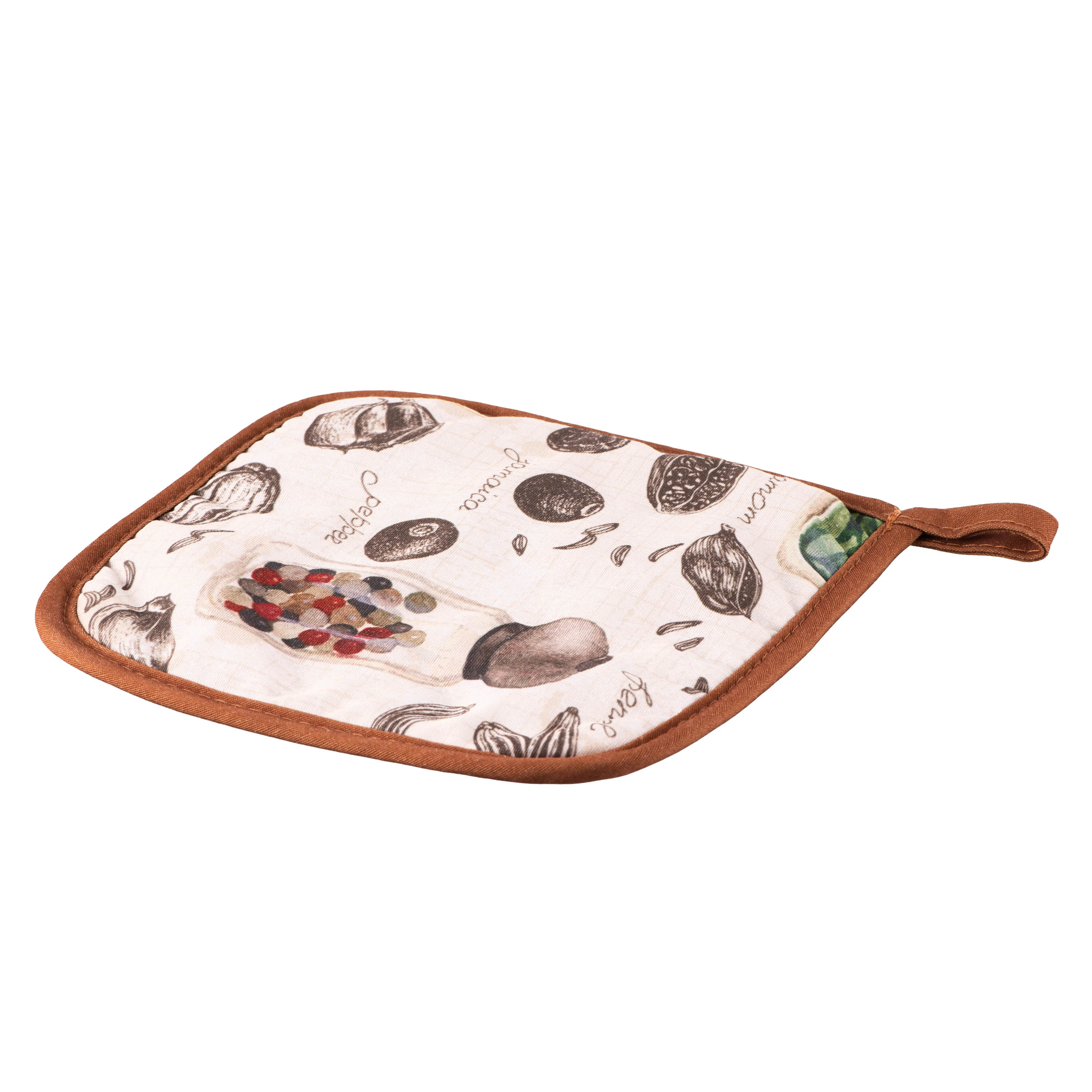 Прихватка – незамінний на кожній кухні аксесуар, який вбереже руки від опіків під час приготування. Кілька прихваток у дизайні Spice прикрасять робоче місце на будь-якій кухні та полегшать приготування. Розмір виробів з набору становить 17 × 28 см та 20 × 20 см. Матеріали виготовлення поліестер (90 %) і бавовна (10 %) забезпечать тривалий термін слугування. Під час догляду потрібно дотримуватися таких умов: прати в пральній машині за 30 °C на делікатному режимі; сушити в машині за низької температури; не відбілювати; не чистити будь-яким розчинником, крім трихлоретилену; прасувати за температури до 110 °C.