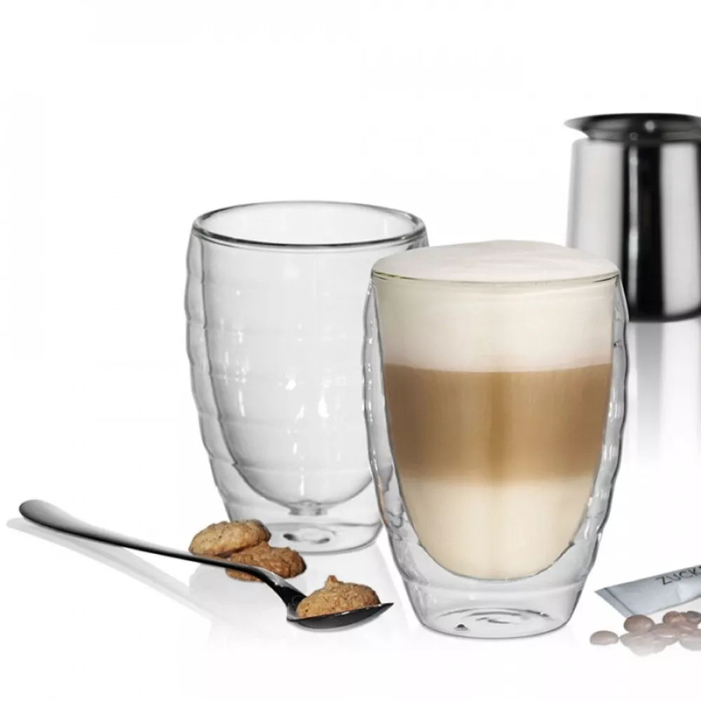 Набір великих склянок з подвійними стінками KELA Cesena вигідно відрізняється стильним зовнішнім виглядом і якістю боросилікатного скла, котре витримує перепади температури від від -30 до +150 градусів. У наборі KELA Cesena дві склянки з подвійними стінками об'ємом 300 мл. кожна. Склянки такого об'єму добре пасують до латте, маккіато, мокко, какао. Зовнішній і внутрішній контури склянок KELA Cesena відокремлені один від одного повітряним прошарком, що має мінімальну теплопровідність, тому гарячі кавові напої в таких склянках довгий час будуть залишатися гарячими, а зовнішній контур склянки при цьому нагріватися не буде.