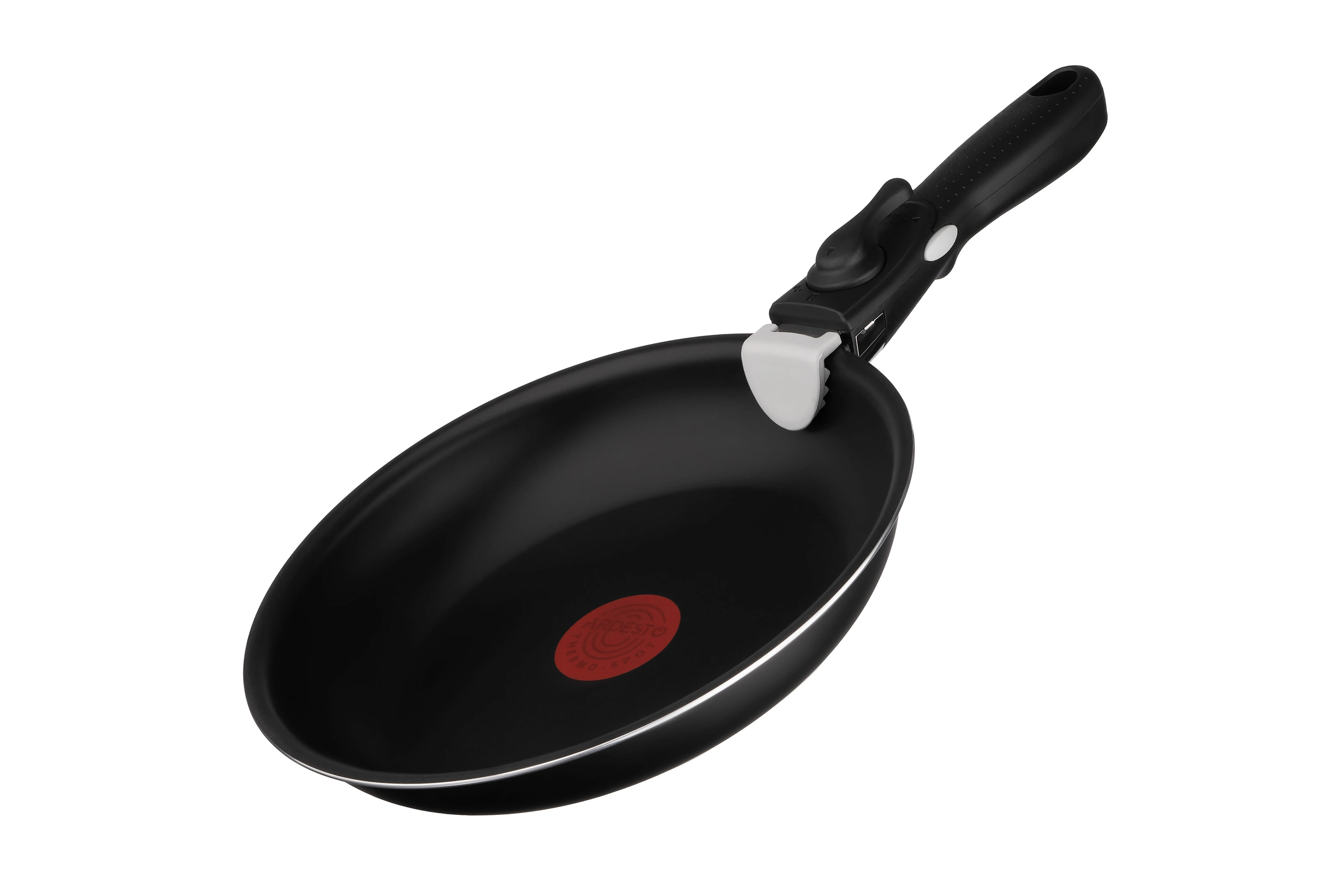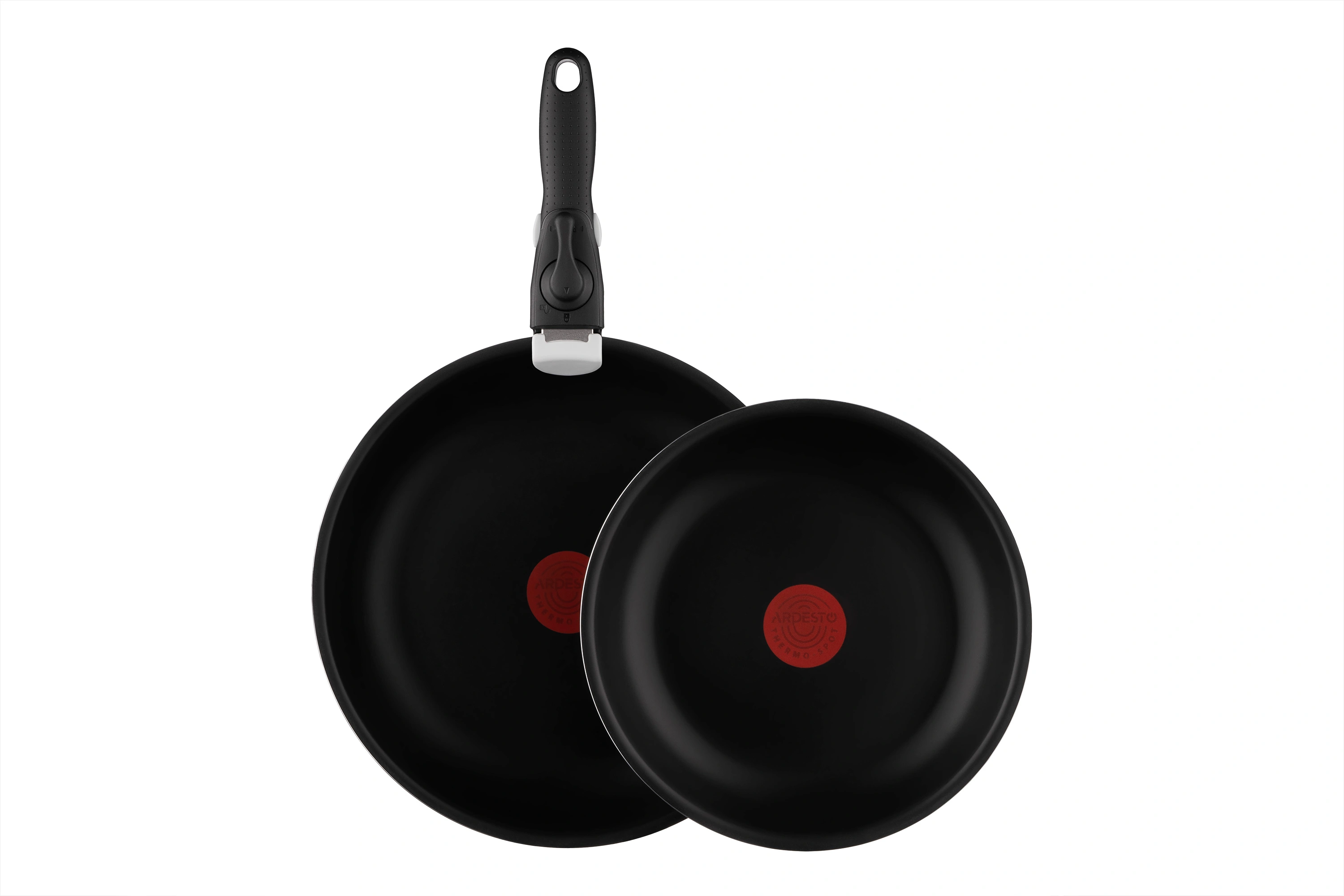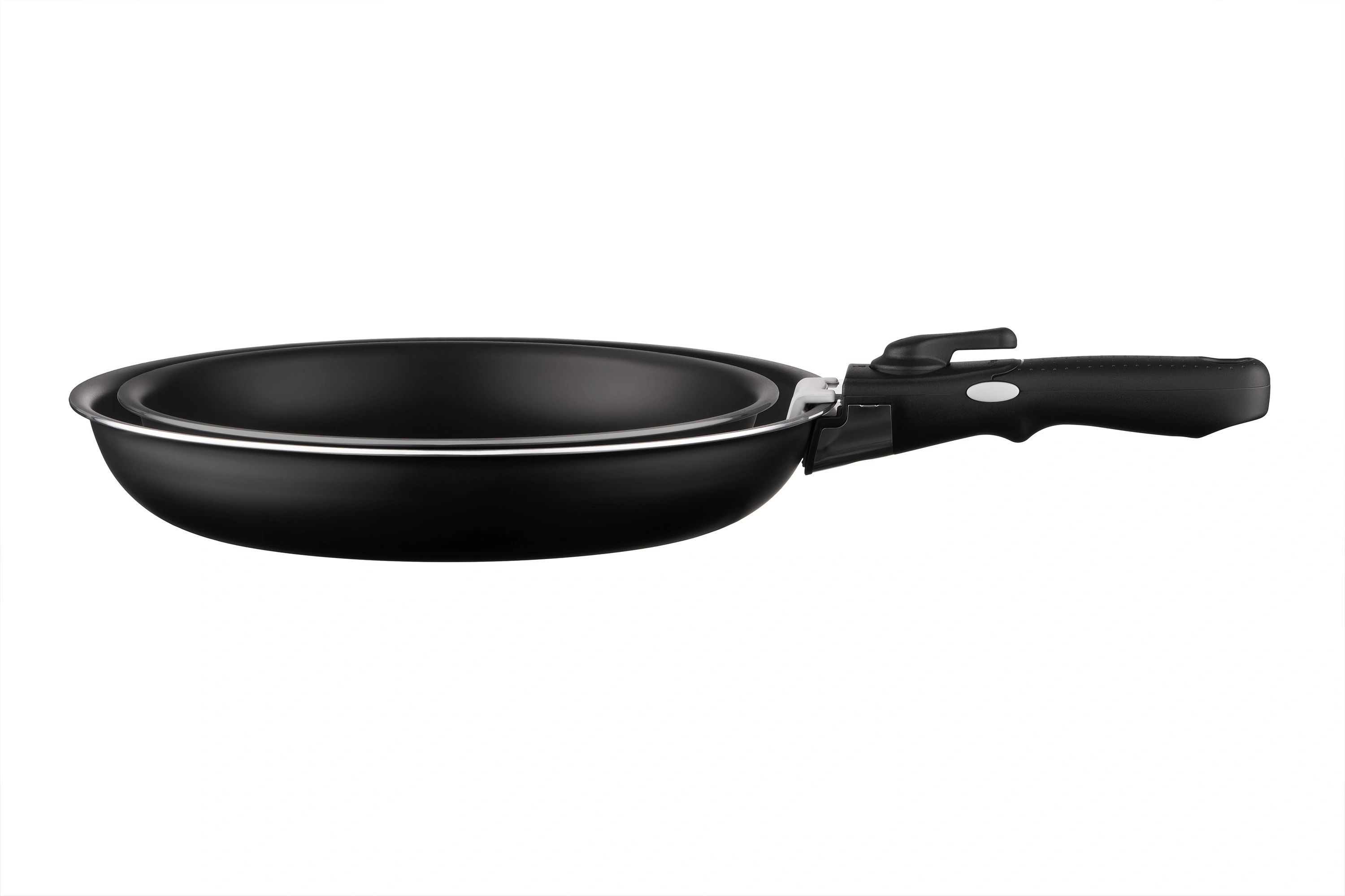 Набір складається із трьох предметів: двох пателень і знімного бакелітового руків’я із soft-touch-покриттям. Є надзвичайно вдалим рішенням для любителів розумно використовувати вільний простір. Сковороди виготовлено з алюмінію, зсередини вкрито протипригарним покриттям. На дні завтовшки 2,5 мм передбачено датчик температури.