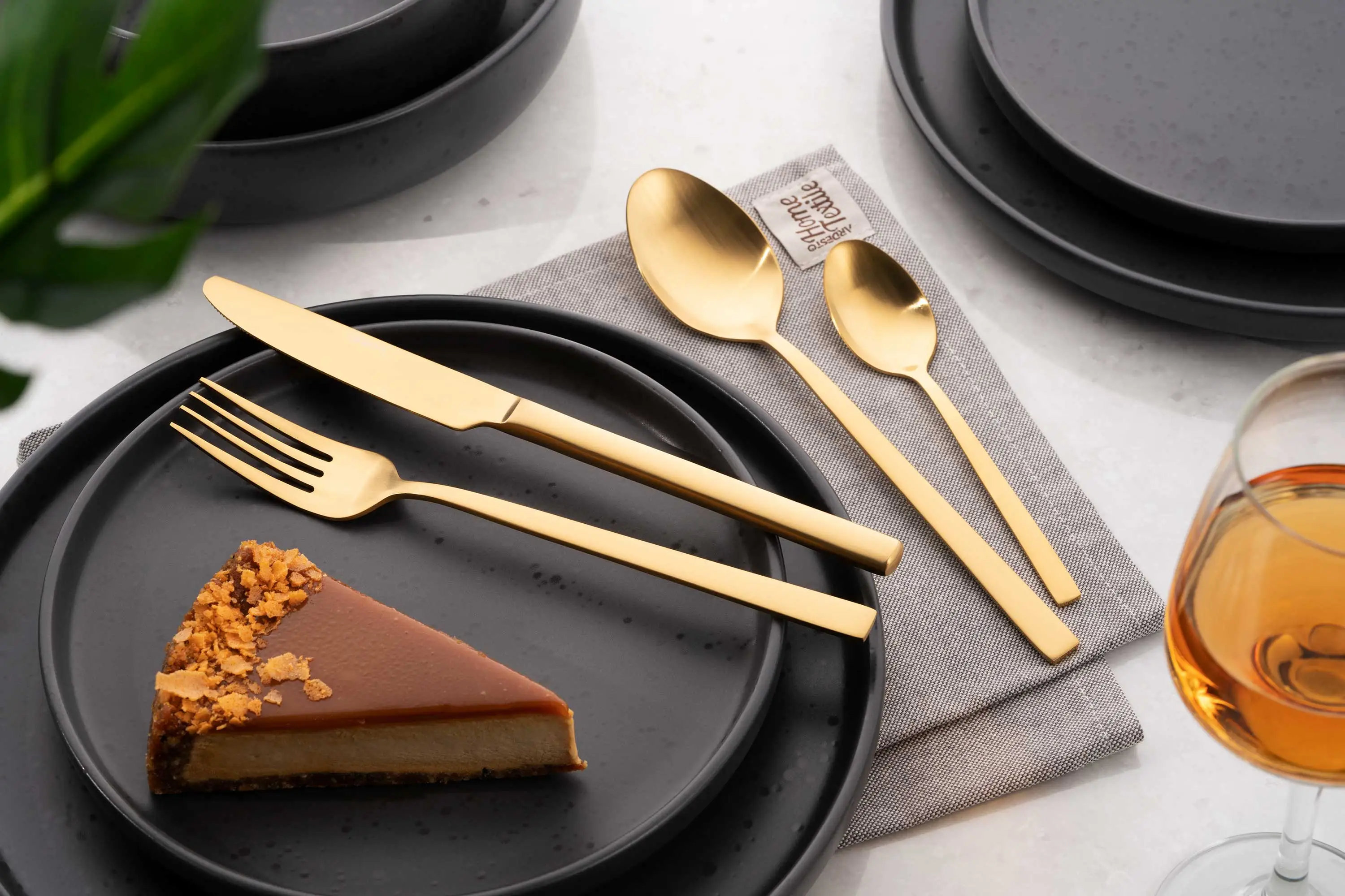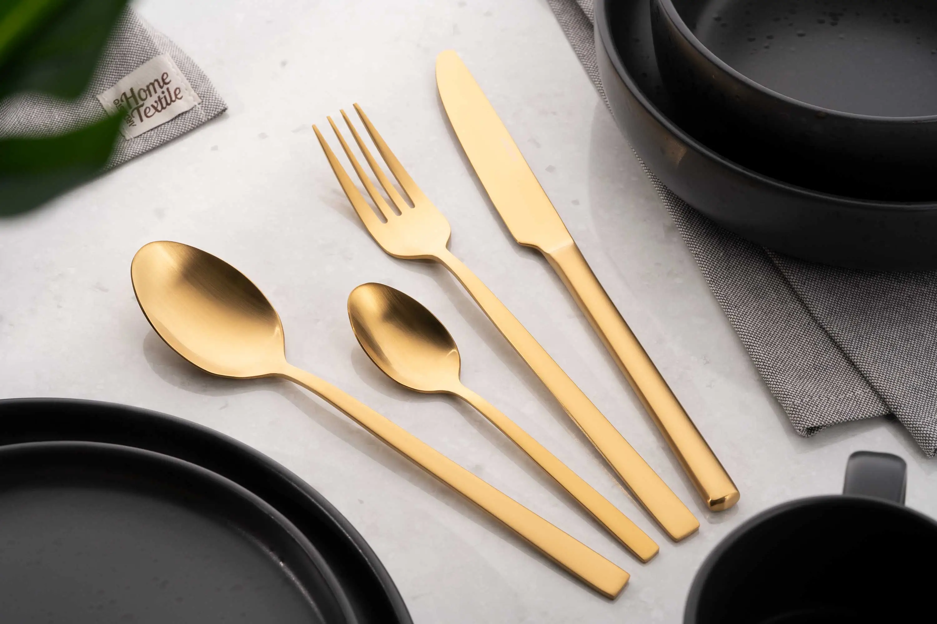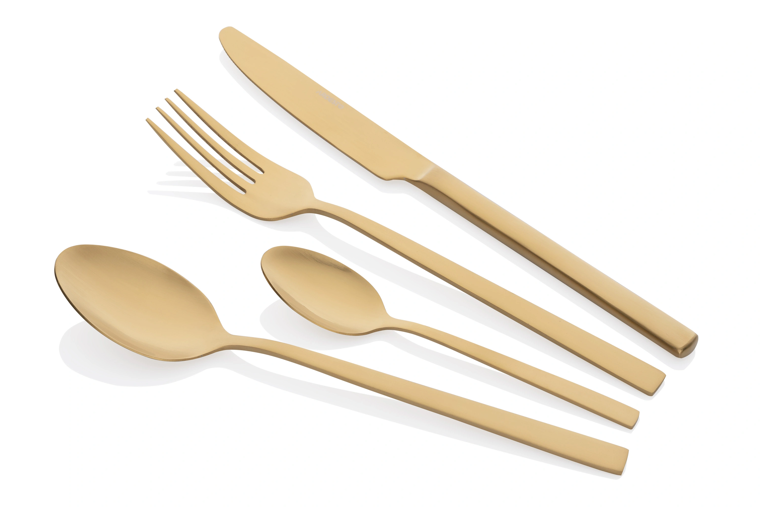 Столові прибори ARDESTO Black Mars Favola золотавого матового кольору – важливі елементи сервірування столу як за щоденного використання, так і для свят. Набір складається з чотирьох предметів: столової ложки; столової виделки; столового ножа; чайної ложки. Зручні вироби виготовлено з нержавіючої сталі, яка вирізняється міцністю, гігієнічністю та стійкістю до корозії. Мають елегантний дизайн і ергономічну форму. Вироби прості в догляді – можна мити в посудомийній машині.