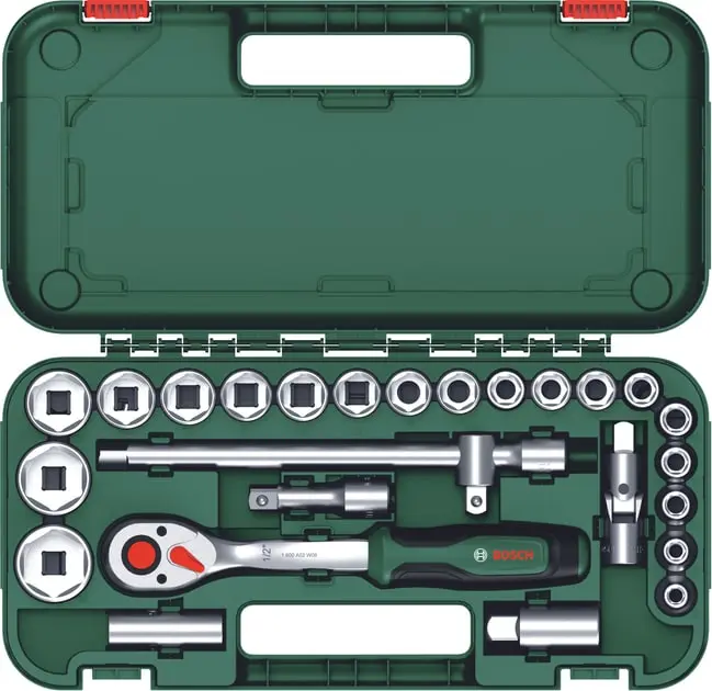 Набір надміцних тріскачок Bosch 1/2" з 25 деталей - це все, що потрібно для ремонту та монтажу автомобілів. Набір складається з тріскачки 1/2", 19 торцевих головок з приводом 1/2», 2 торцевих головок для свічок запалювання, 2 подовжувачів і 1 перехідника з карданним шарніром - все це в практичному кейсі для інструментів.