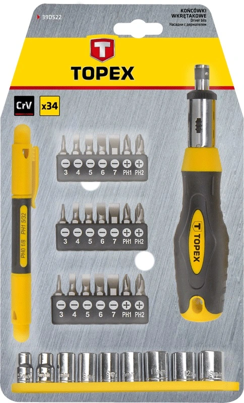 Змінні наконечники TOPEX виготовлені з високоякісної хромованадієвої сталі, що забезпечує довгий термін служби інструменту. Ергономічна рукоятка, покрита антиковзаючим матеріалом, забезпечує високий комфорт користування. Трещеточний механізм в рукоятці дозволяє заощадити час під час роботи. Додатково в наборі є рукоятка у формі авторучки з наконечниками, зручне і практичне рішення. Бренд TOPEX призначений для домашніх майстрів.
