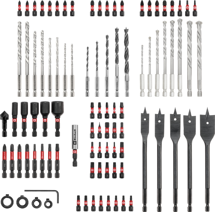 Einhell M-Case XL (95 предметів) — універсальний набір для свердління й загвинчування в металі, дереві та кладці. У комплекті: біти S2 (25/50 мм), свердла HSS по металу, по дереву й по кладці, торцеві головки 5–13 мм, зенкер 12 мм, магнітний тримач, обмежувачі глибини. Поставляється в міцному кейсі; сумісний з (ударними) акумуляторними шуруповертами та дрилями.
