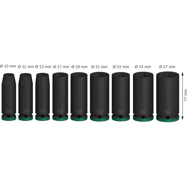 Набір ударних торцевих головок Bosch Pro Impact Socket Deep Set 1/2" 10-27 мм призначений для надійної роботи з кріпленням, розташованим у важкодоступних і заглиблених місцях. Збільшена довжина 77 мм дає змогу впевнено працювати зі шпильками, що виступають, і заглибленими гайками. Посадковий квадрат 1/2" сумісний з більшістю ударних інструментів. Діапазон розмірів від 10 до 27 мм охоплює найбільш затребувані розміри кріплення.