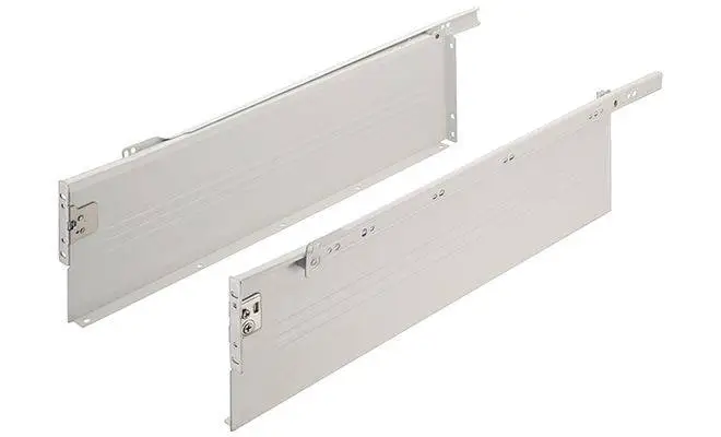 Направляюча система для висувних ящиків металбокс довжиною 350 мм і висотою 150 мм. Виготовлена із сталі, має пластикові закінчення. Система складається із роликових полосок, пара яких витримує до 25 кг. Білого кольору.