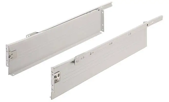 Направляюча система для висувних ящиків металбокс довжиною 550 мм і висотою 118 мм. Виготовлена із сталі, має пластикові закінчення. Система складається із роликових полосок, пара яких витримує до 25 кг. Білого кольору.