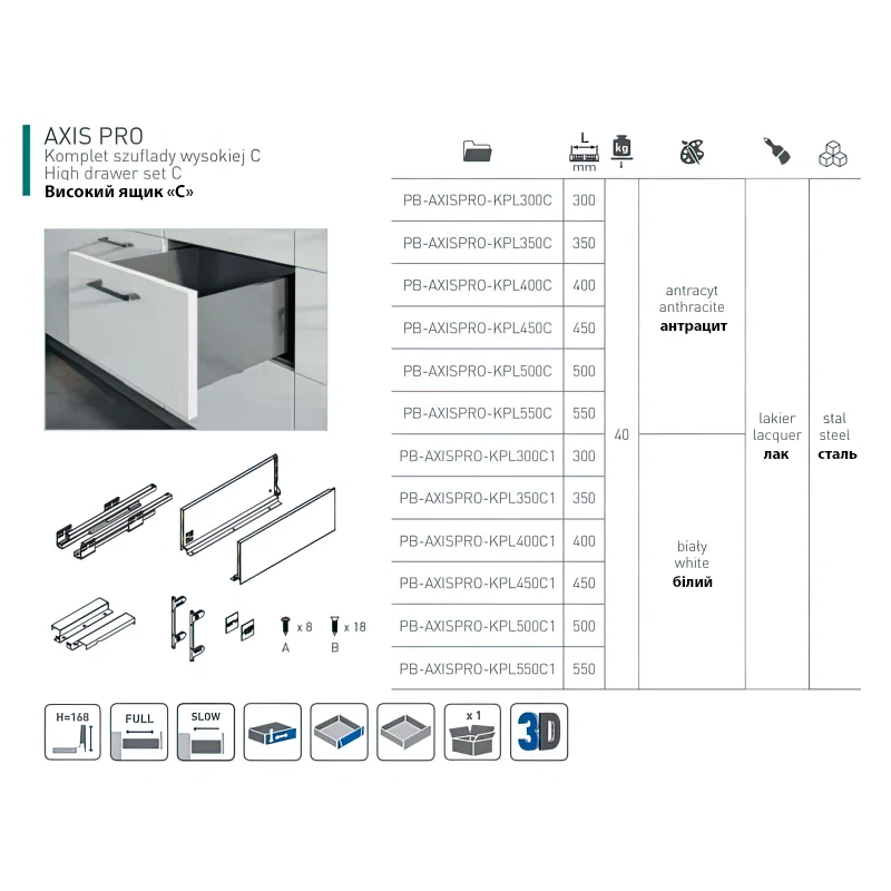 Направляющие GTV AXIS PRO – это надежное решение для выдвижных систем в мебели, обеспечивающее плавный ход и долговечность. Благодаря высоте 167 мм эти направляющие идеально подходят для хранения крупных предметов. Графитовый цвет придаёт мебели стильный и современный вид, подчёркивая её эстетичность.
