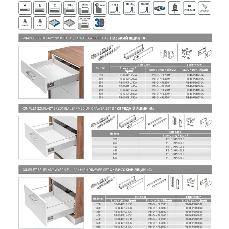 Направляющие GTV MODERN BOX PB-D-KPL400A — это функциональное решение для установки выдвижных ящиков с низкими боковинами. Идеально подходит для нижних модулей или как внутренний ящик. Обеспечивает полное выдвижение и плавное закрытие благодаря встроенному доводчику.