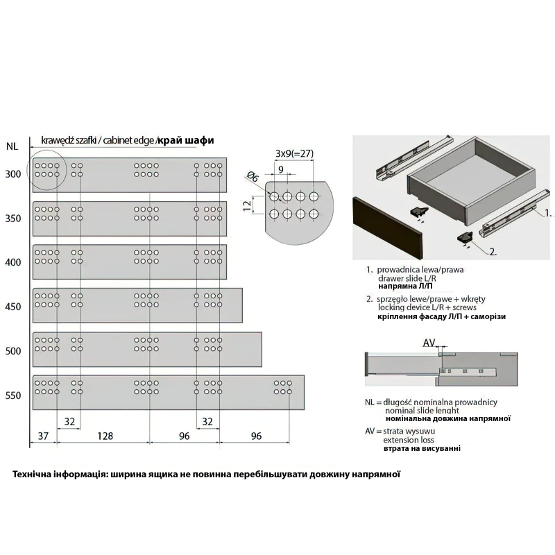 - Толщина боковины ящика: 16–18 мм