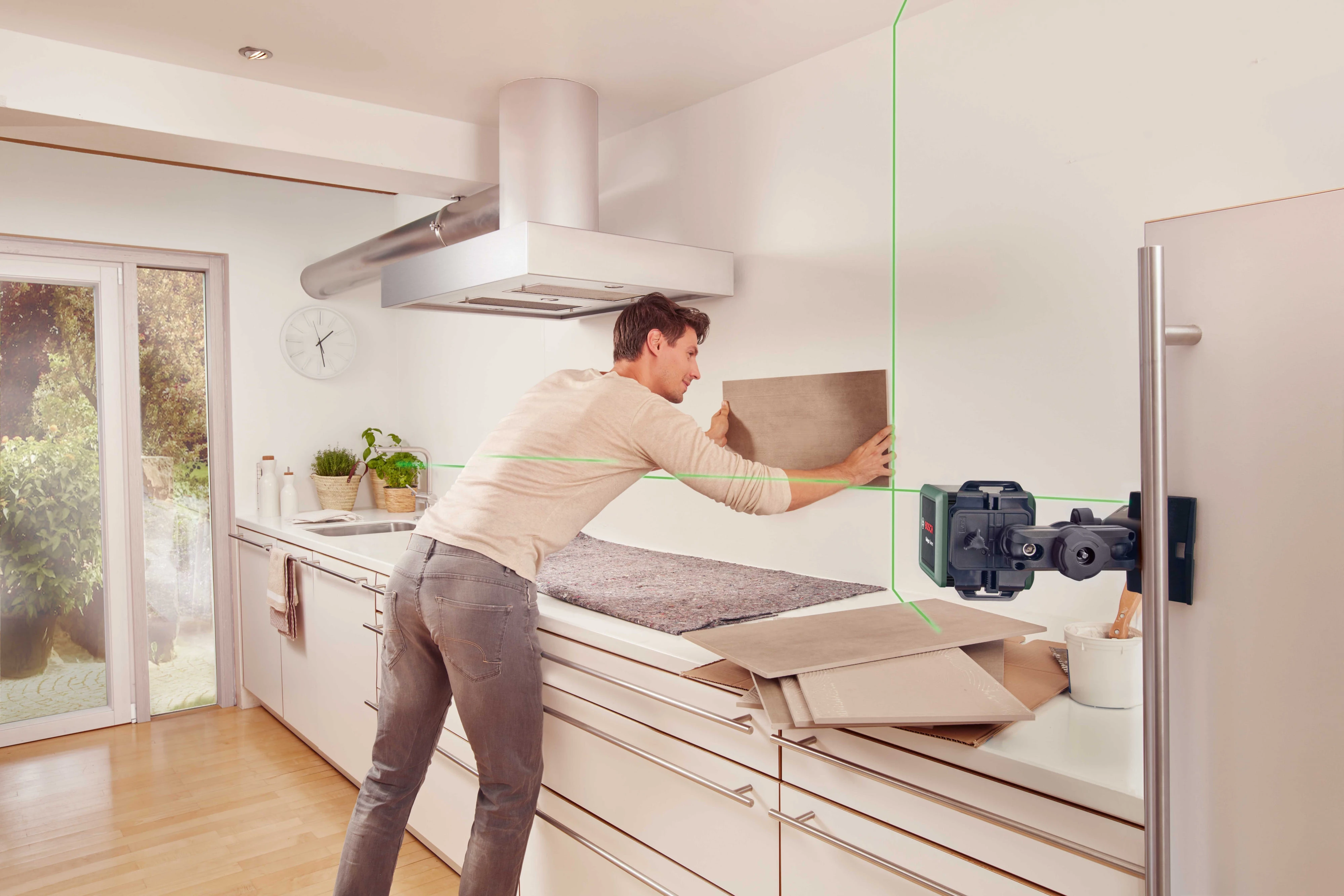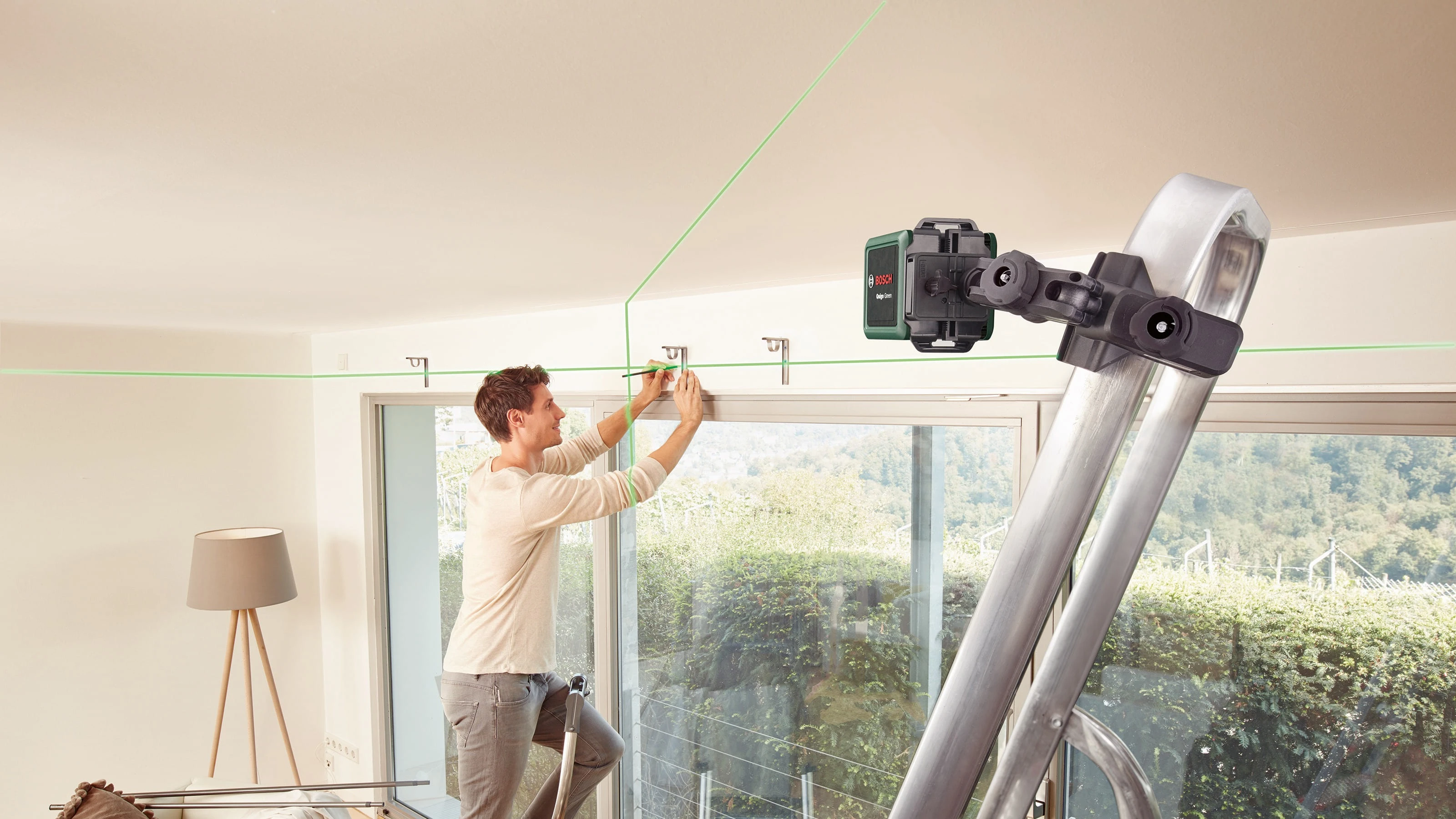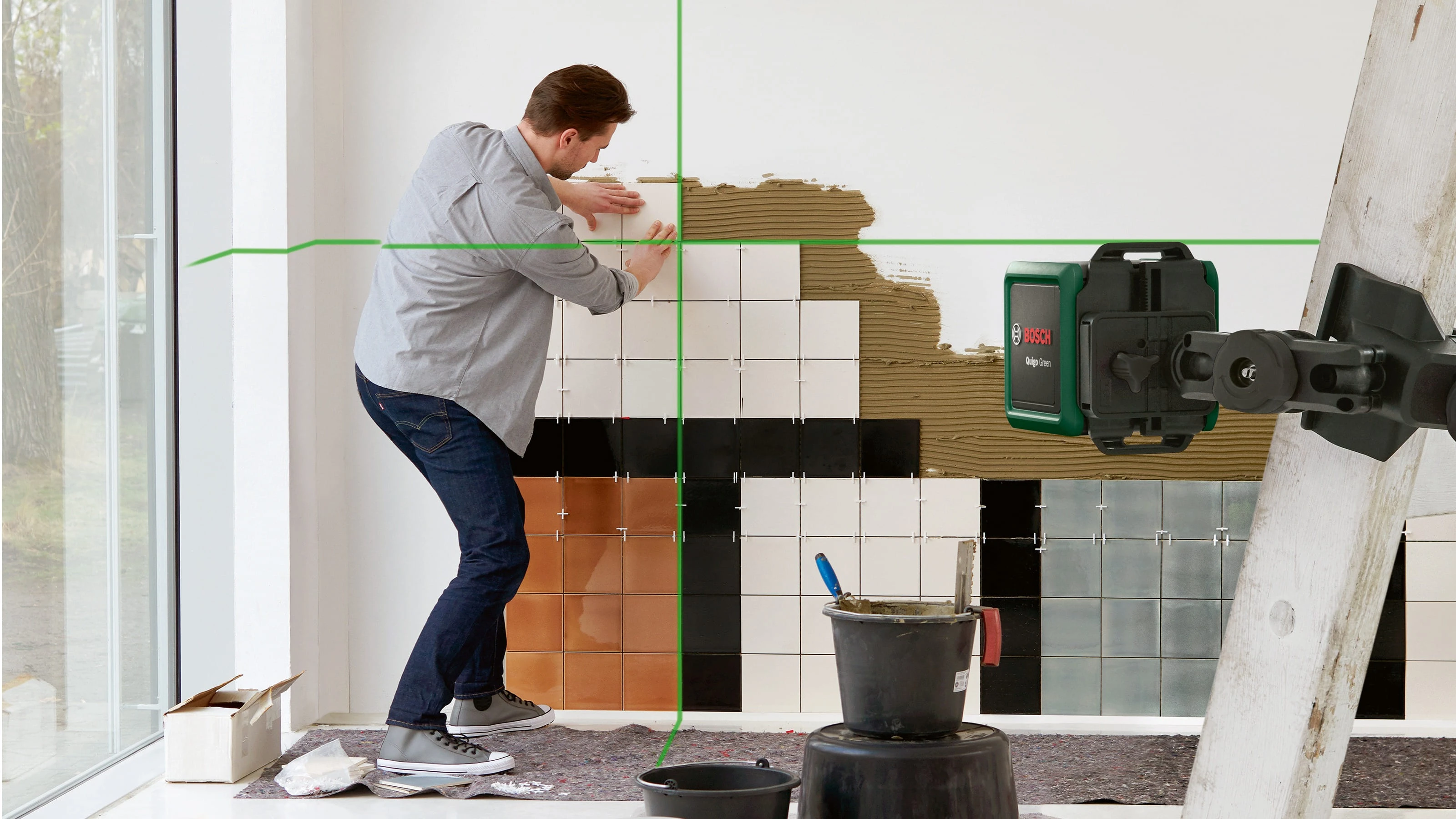 Насолоджуйтесь простотою використання та високою видимістю лазерної лінії Quigo Green Завдяки простому управлінню за допомогою повзункового перемикача Quigo Green самостійно вирівнюється та проектує добре помітні зелені лазерні лінії, які можна побачити навіть при яскравому освітленні. Цей перехресний лазер є відправною точкою для Bosch, коли мова заходить про екологічність електроінструментів. Станьте екологічно чистим на всьому шляху з новим поколінням зеленого поперечного лазера Quigo Green від Bosch, який забезпечує високу видимість і простоту використання в проектах "зроби сам".