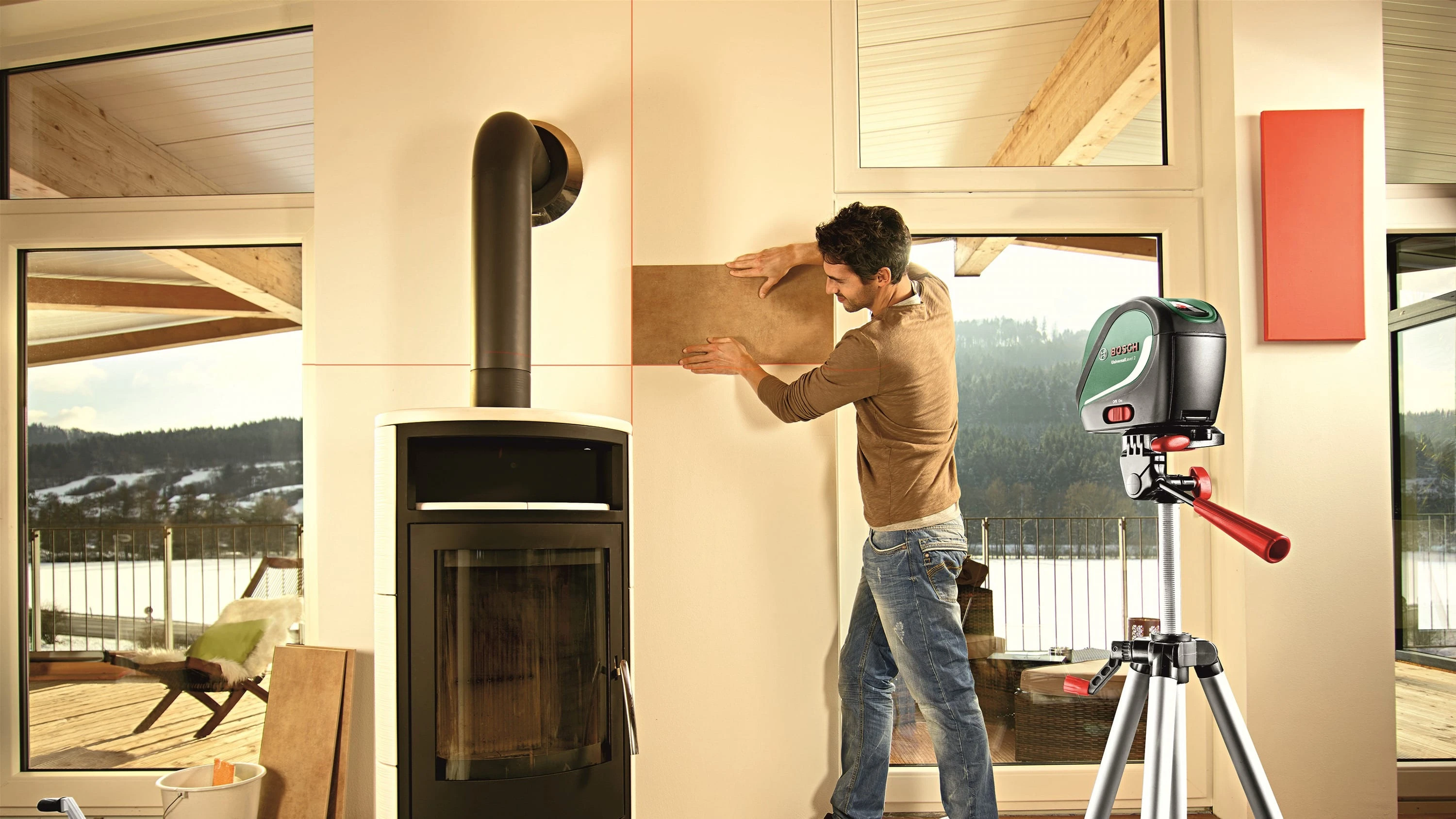 Bosch UniversalLevel2 - це простий і зручний лазерний нівелір, який ідеально підходить для домашнього використання. Він проєктує горизонтальну і вертикальну лінії, які допоможуть вам вирівняти картини, полиці, меблі та інші предмети.