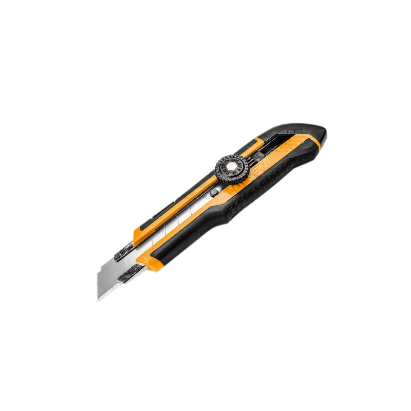 Ніж сегментований Tolsen 30092 з шириною леза 18 мм оснащений ергономічним двокомпонентним корпусом із ABS-пластику та термопластикової гуми. Має металеву напрямну, фіксатор леза типу Twist-Lock (коліщатком), збільшений ламач і вбудований картридж для зберігання двох запасних лез. Надійний інструмент для точного й безпечного різання в побуті та на будівництві.