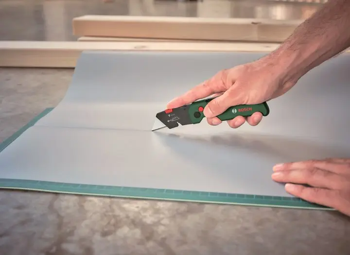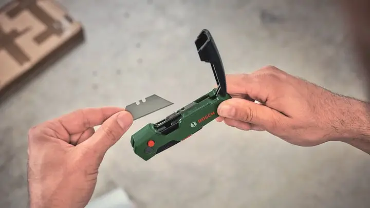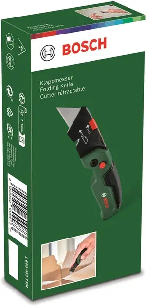 Складаний ніж від Bosch має довговічну конструкцію та пропонує майстрам, які займаються домашнім ремонтом, широкий спектр можливостей для різання. Для зручності використання та контролю ніж має міцний корпус із м'якою ручкою, ергономічну виїмку для пальців і затискач для носіння на поясі. Безпека та зручність використання ножа максимально підвищена: механізм плавного складання леза дозволяє відкривати його однією рукою, кнопка з витяжним механізмом полегшує заміну леза, а кілька стандартних запасних лез SK5 зберігаються в тильній частині ножа.