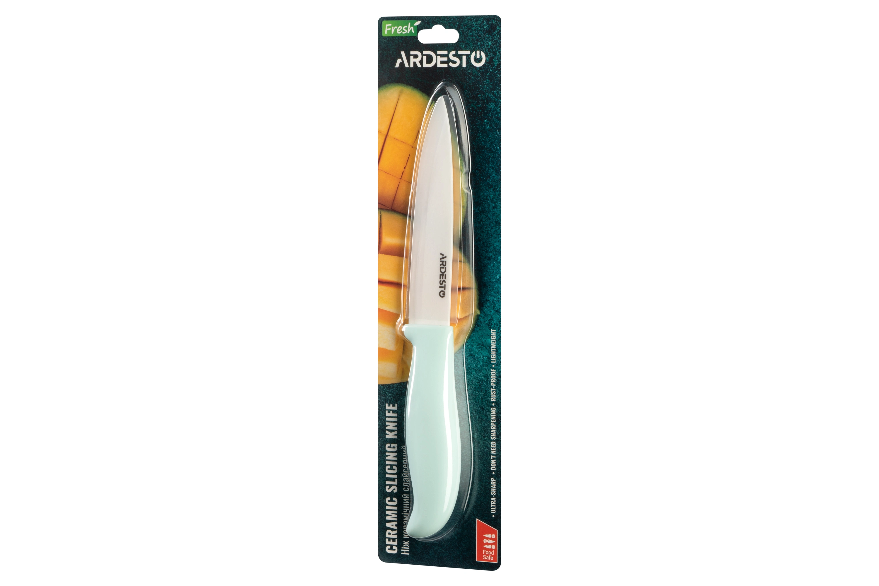 Слайсерний ARDESTO Fresh займе особливе місце з-поміж кухонного приладдя. Його оснащено клинком завдовжки 12,5 см для ідеально тонкого нарізання рівних шматків продуктів. Гостре керамічне лезо не потрібно заточувати, воно не боїться впливу вологи та не вбирає запахів. Конструкцією передбачена вигнута пластикова ручка кольору блакитний тіфані, що робить ніж легким, безпечним і зручним. Ніж слайсерний ARDESTO Fresh потребує нарізання на дерев’яних і пластикових дошках і заборонений до використання на кам’яних і скляних.