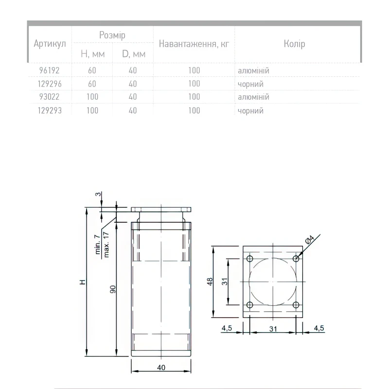 Ножка мебельная регулируемая DC NA 02C00 Н-100мм Алюминий
