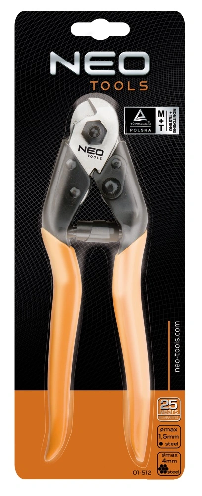 Ножиці для різання сталевого дроту і троса 1000 В NEO, розмір 190 мм. Загартовані губки ріжуть сталевий дріт з максимальним діаметром 1.5 мм, а також сталевий трос з максимальним діаметром до 4.0 мм. Високосортна хромованадієва сталь гарантує довголітню міцність губок. Ергономічні рукоятки з ПВХ-покриттям підвищують комфорт експлуатації. Якість інструменту підтверджено сертифікатом TÜV і 25-річною гарантією виробника. Бренд NEO виправдовує очікування професіоналів.