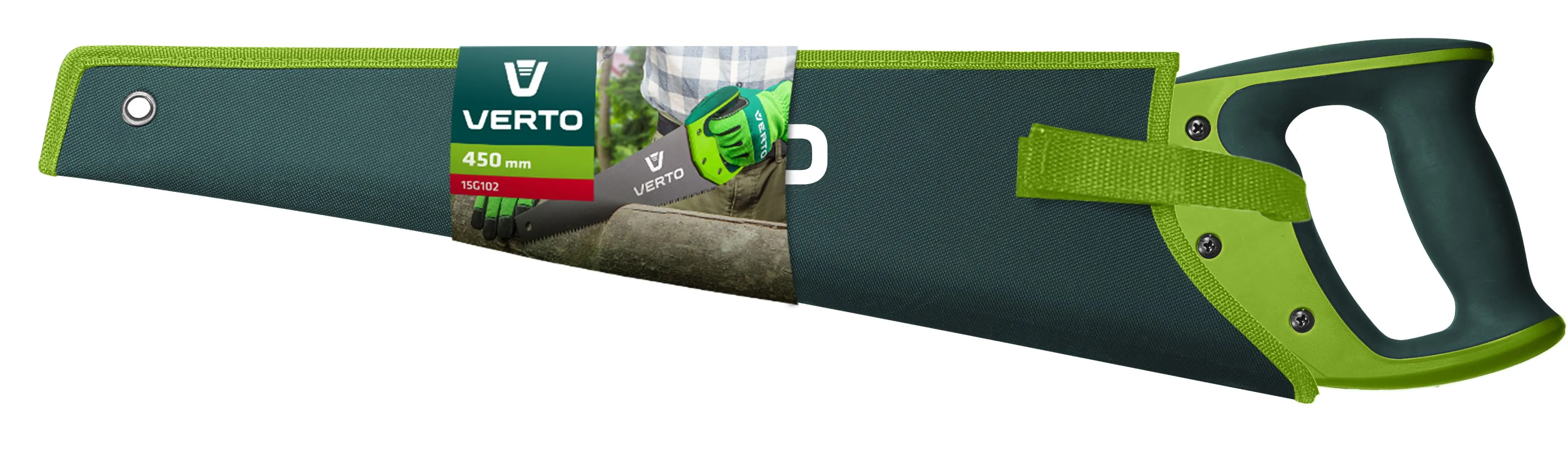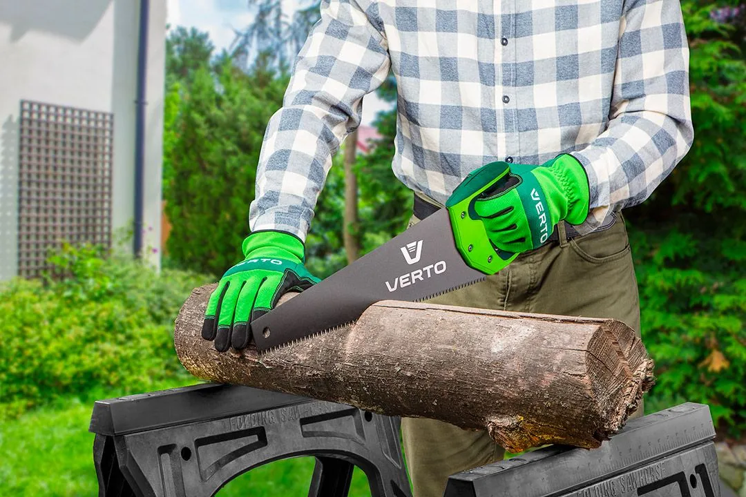 Ножівка VERTO (арт. 15G102) довжиною 450 мм. Тристороннє гостріння та гартування зубців значно знижує супротив під час різання, натомість тефлонове покриття спрощує розпилювання дерева вздовж волокон.