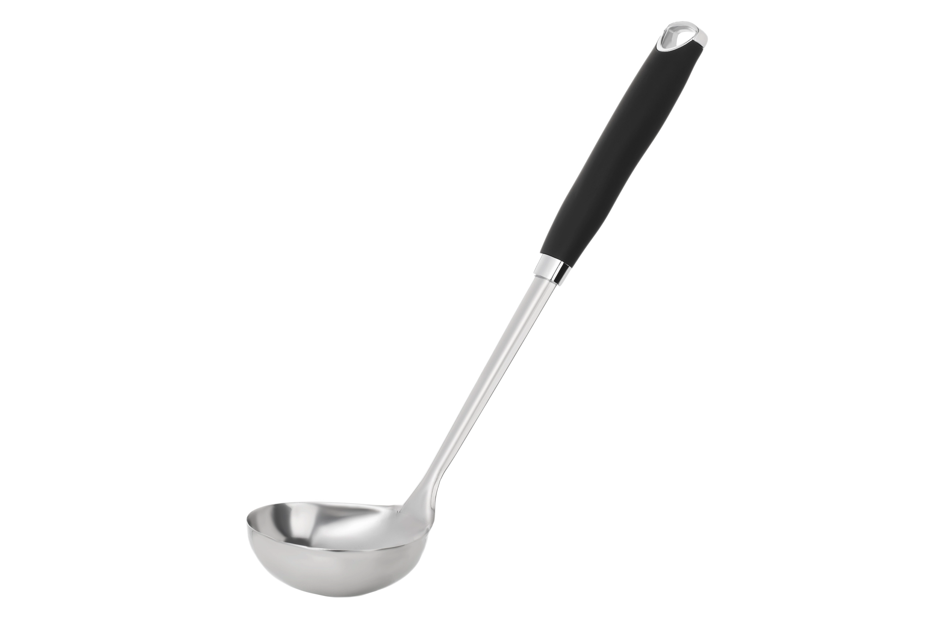 Зручний стильний ополоник з нержавіючої сталі завдовжки 31,5 см і діаметром ківшу 9 см. Оснащений ергономічним пластиковим руків’ям, що не нагрівається і є приємним на дотик. Не рекомендовано мити в посудомийній машині.