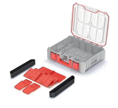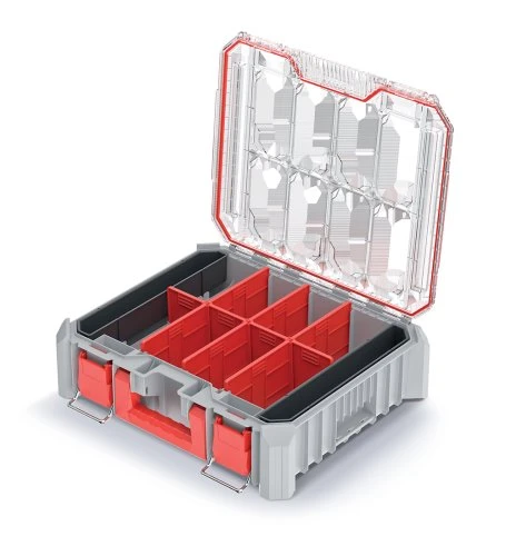 Органайзер із серії C BLOCK COOL GREY 4C поєднує функціональність і стильний дизайн. Оснащений 2 знімними лотками та 7 перегородками для оптимальної організації. Прозора кришка з міцного полікарбонату, металеві петлі та фіксатори забезпечують довговічність і захист. Ергономічна ручка та ущільнювач на кришці гарантують зручність транспортування, пилонепроникність і водостійкість.