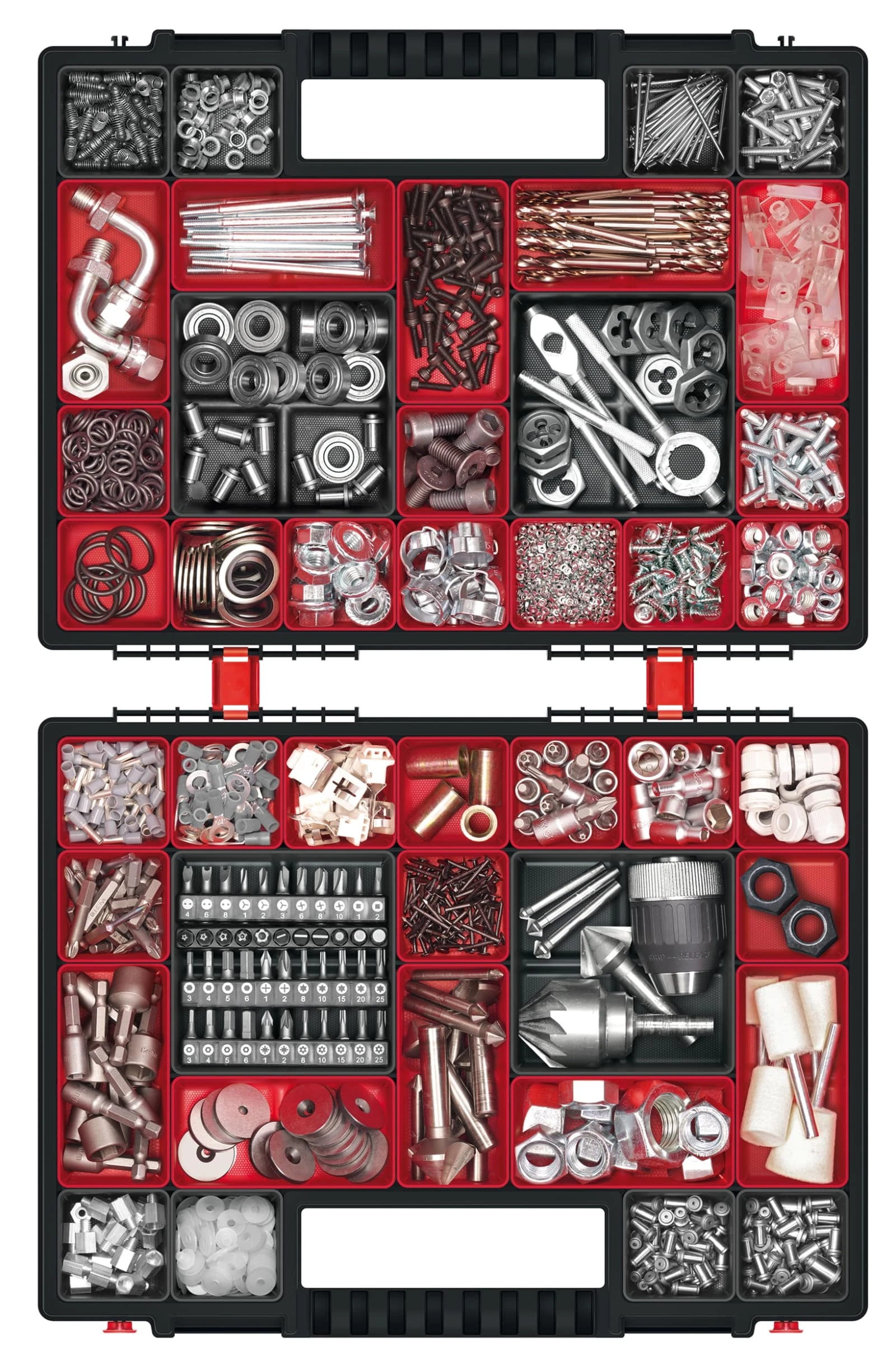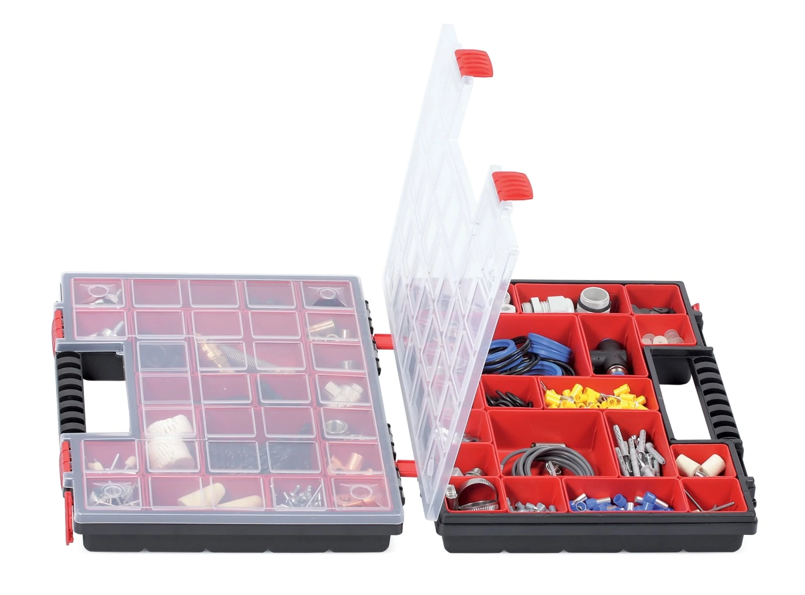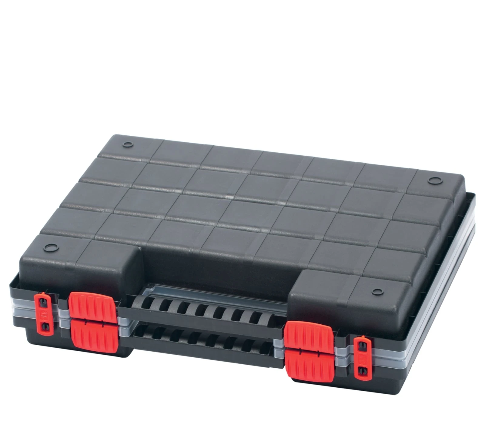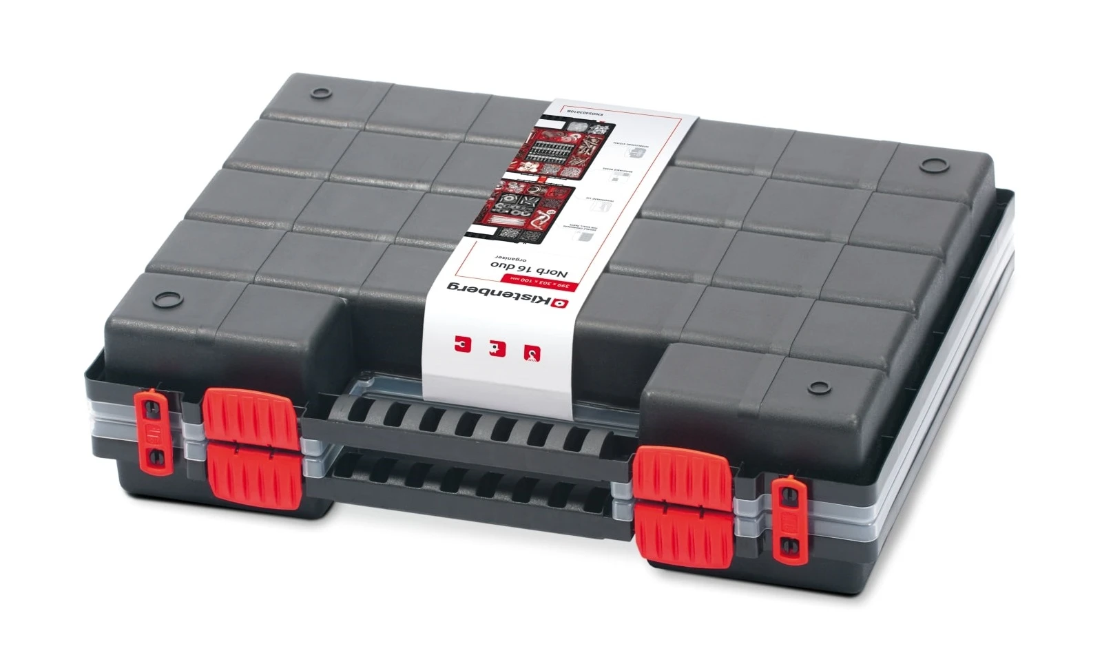 Практичний органайзер для інструментів Kistenberg NORB DUO 40 (39.9x30.3x10 см) з 42 знімними стаканчиками для зручного зберігання та сортування дрібних деталей. Оснащений прозорою кришкою з поліпропілену, що дозволяє легко переглядати вміст, ергономічною ручкою для транспортування та міцними засувками для надійного закриття. Корпус виготовлений із високоміцних полімерів, що забезпечує довговічність.