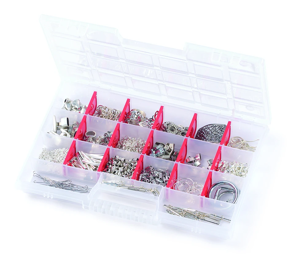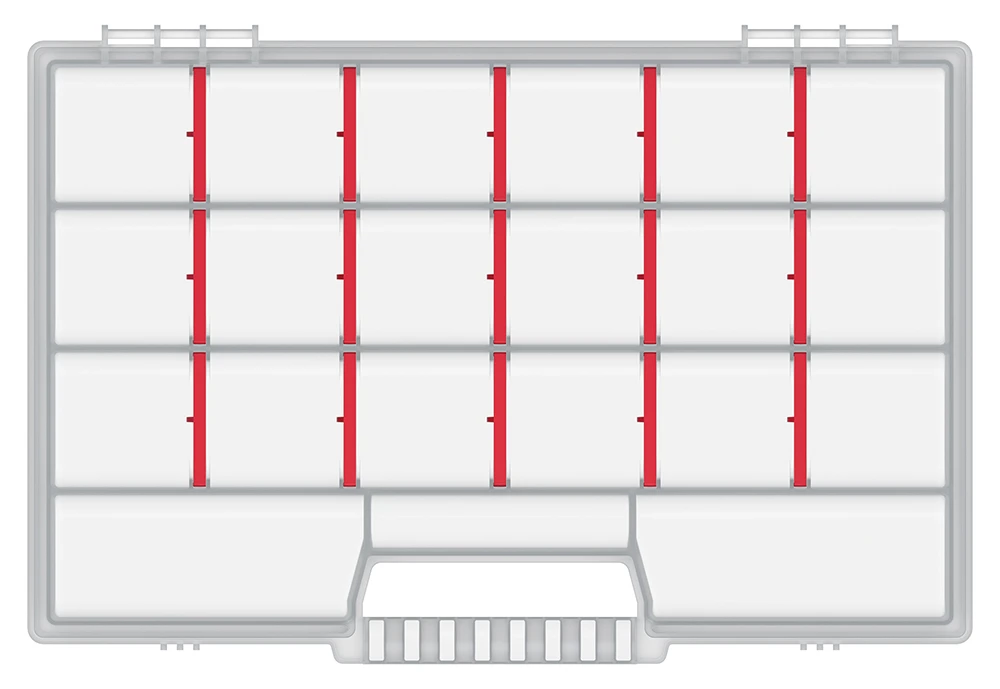 Органайзер NORT 35 (34.4x24.9x5 см) оснащений 15 знімними перегородками для зручного зберігання дрібних інструментів і деталей. Прозора поліпропіленова кришка дозволяє легко переглядати вміст, а міцні засувки забезпечують надійне закриття. Ергономічна ручка гарантує комфортне транспортування.