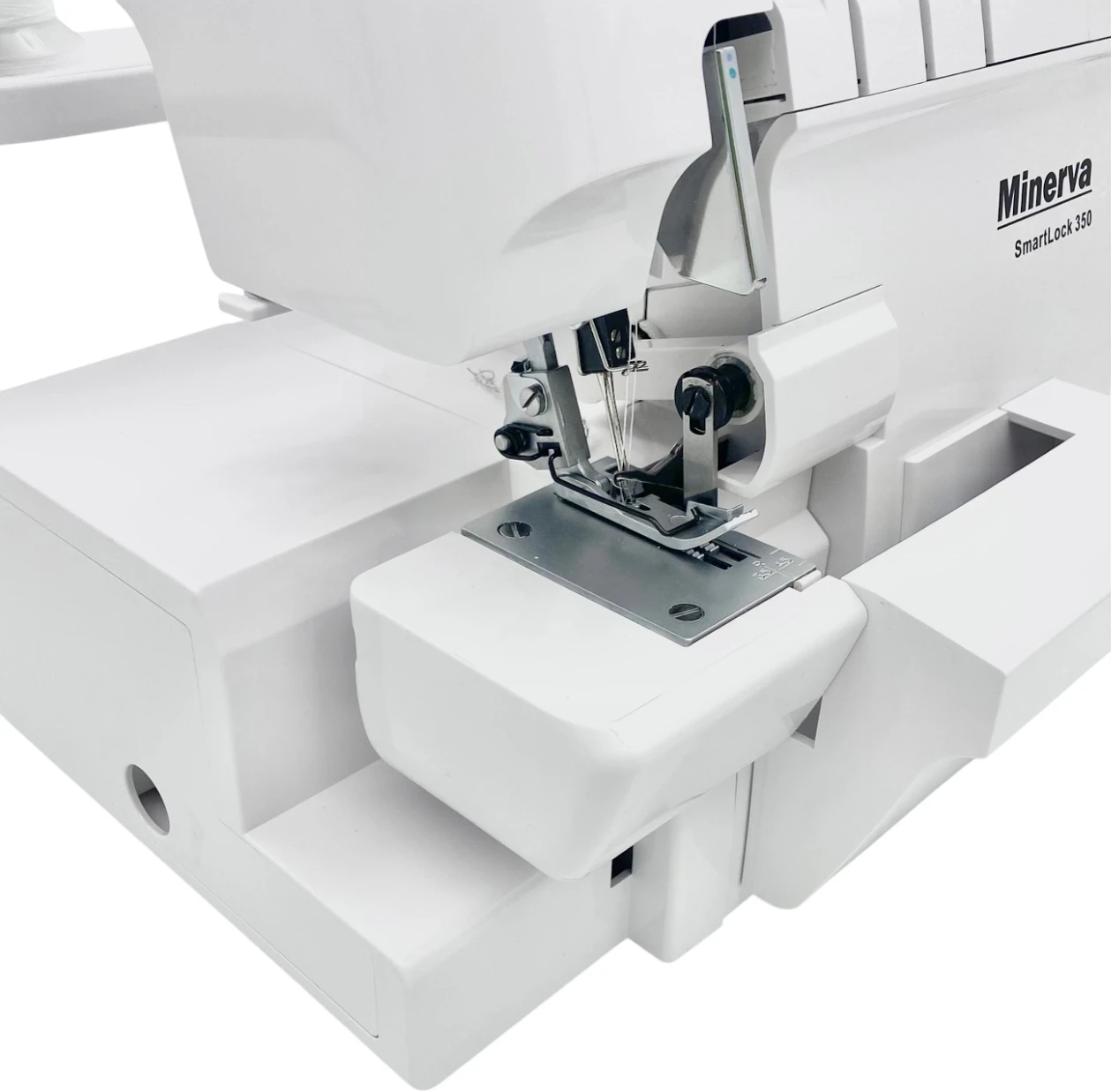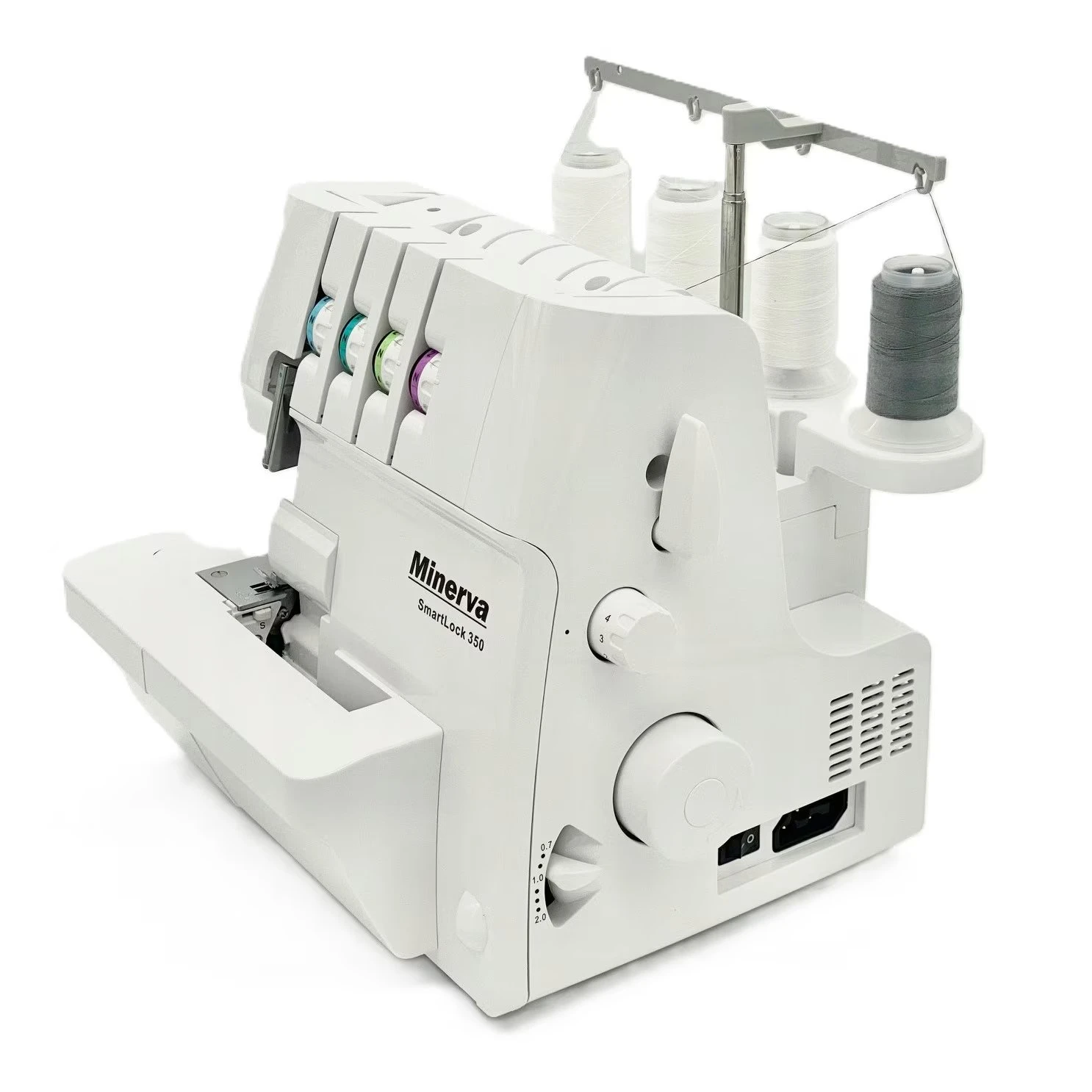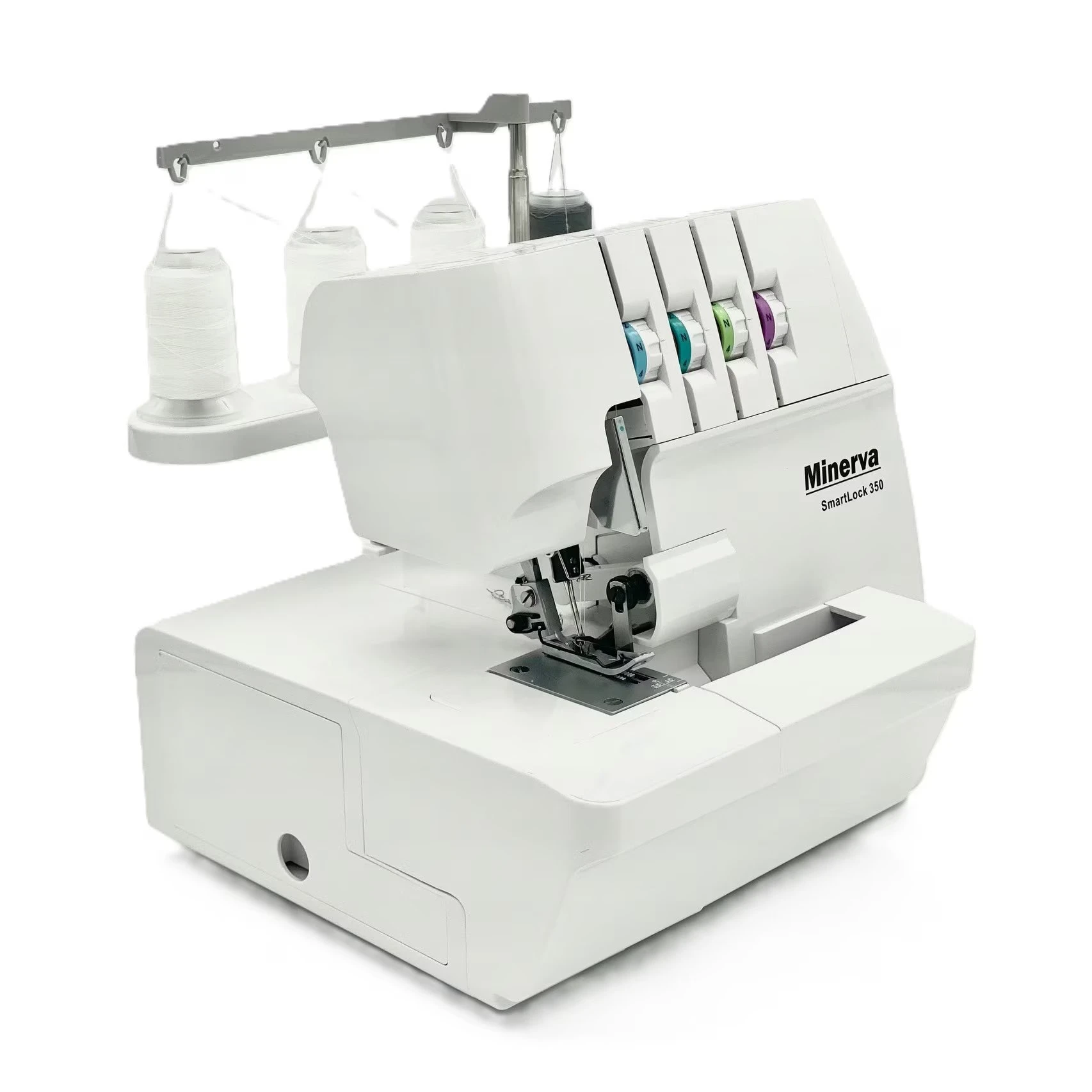 Оверлок Minerva Smartlock 350 – 2, 3, 4-х нитковий оверлок із рукавною платформою, що виконує 8 основних обметувальних швів. Підходить для всіх типів тканин – від тонких до джинса, завдяки регулюванню тиску лапки. Диференціальний транспортер забезпечує якісну обробку трикотажу. Оснащений сучасною системою прямих ниткопровідників, спрощеною заправкою ниток з колірними мітками, підказками для легкої заправки та можливістю відключення ножа.