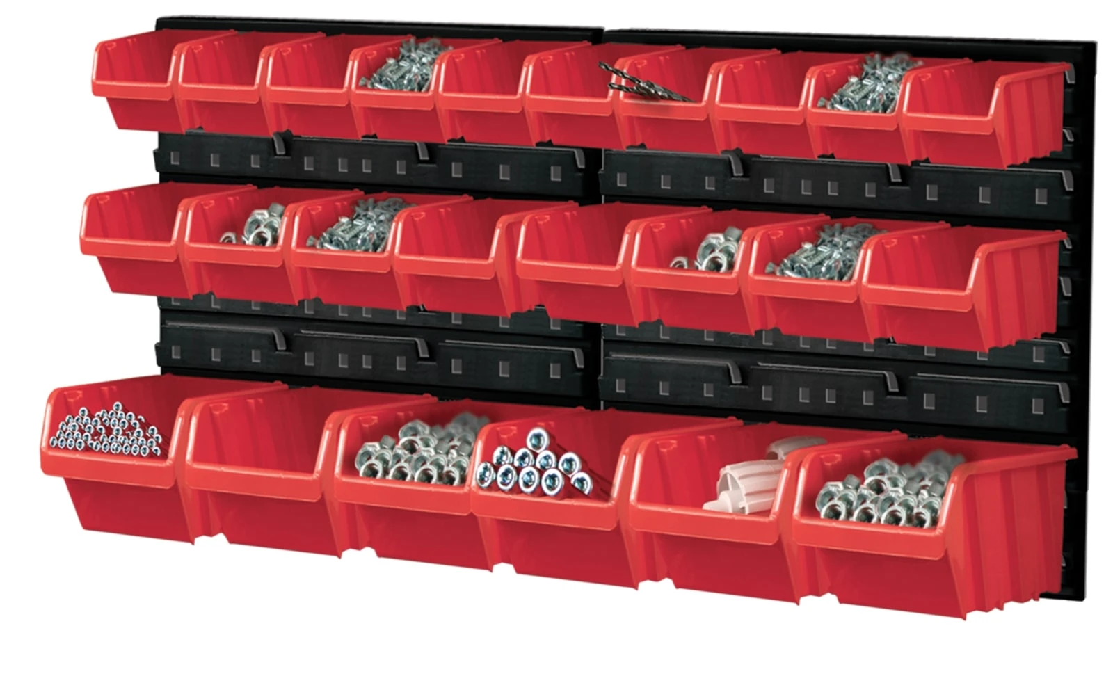 Підвісна панель Kistenberg KOR2 з контейнерами (24 од.) - зручне рішення для організації інструментів та аксесуарів у майстерні, гаражі чи на складі. Комплект містить 2 панелі (38.6×1.8×39 см) та 24 контейнери у трьох розмірах, що дозволяє ефективно впорядкувати робочий простір.