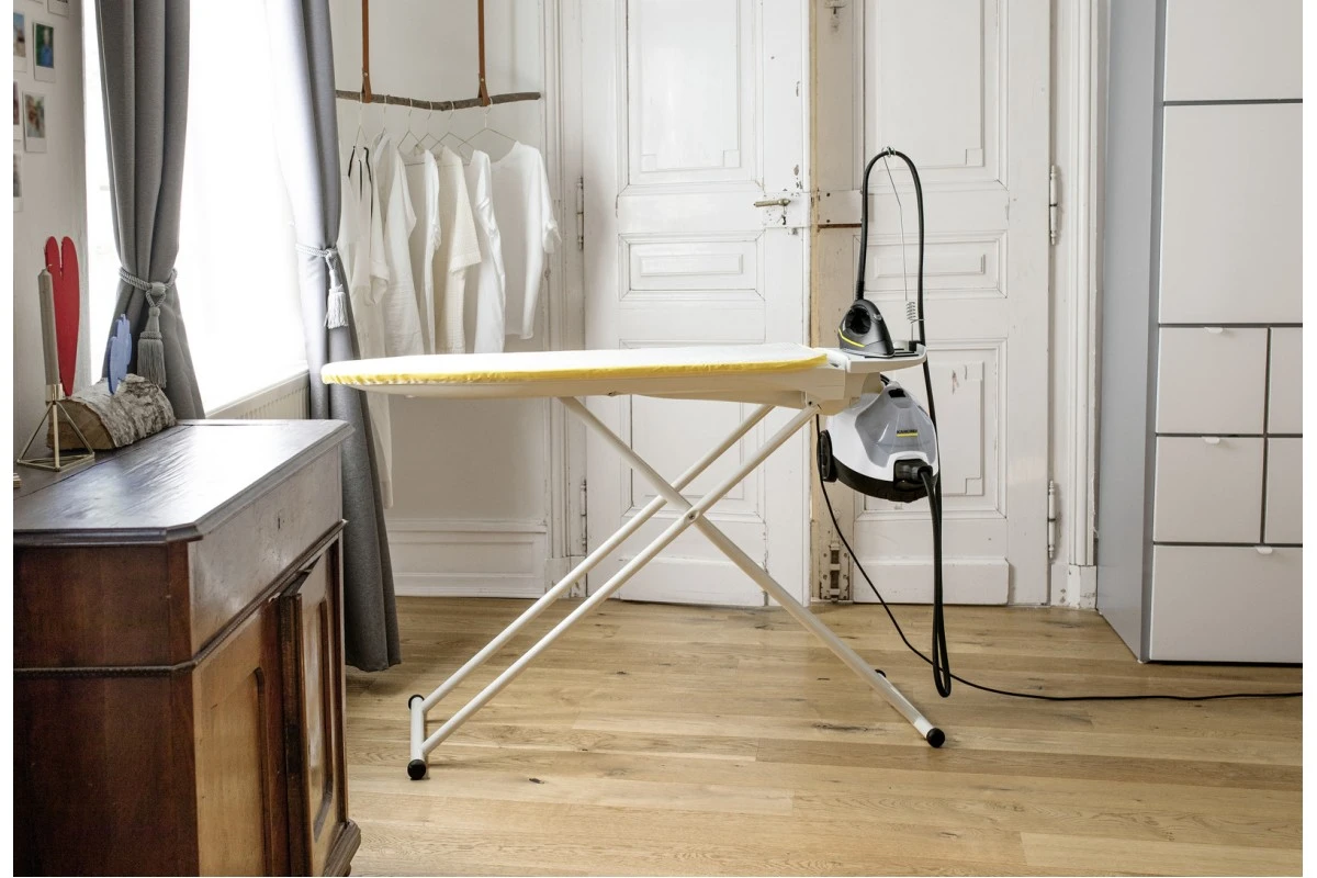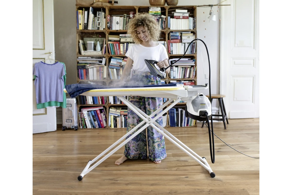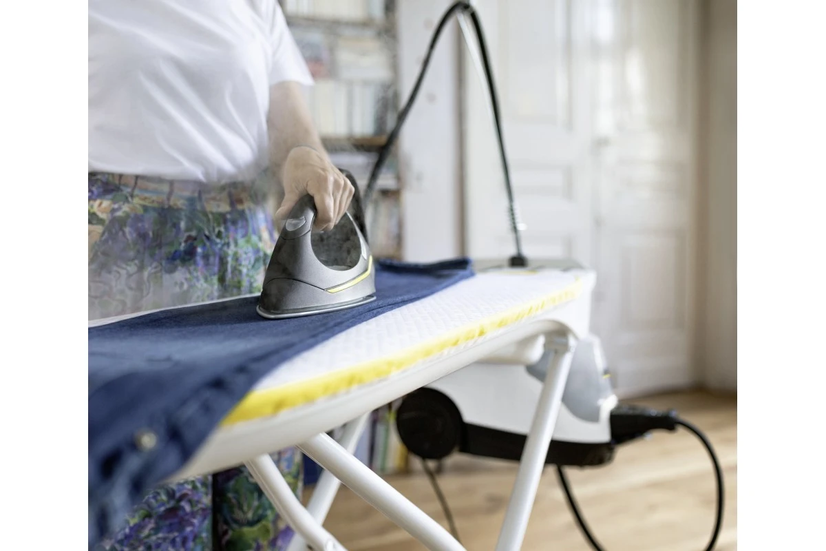 Karcher SI 4 EasyFix Iron – ефективне парове очищення та прасування. Прасувальна станція скорочує час у два рази завдяки паровій прасці та активній дошці з повітряною подушкою. Пароочисник усуває 99,999% вірусів і 99,99% бактерій без хімії, легко очищаючи плитку, варильну панель, витяжку та щілини. Насадка EasyFix з гнучким шарніром гарантує ідеальні результати, а система липучок дозволяє змінювати серветку без контакту з брудом.