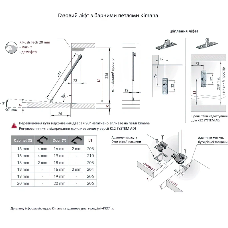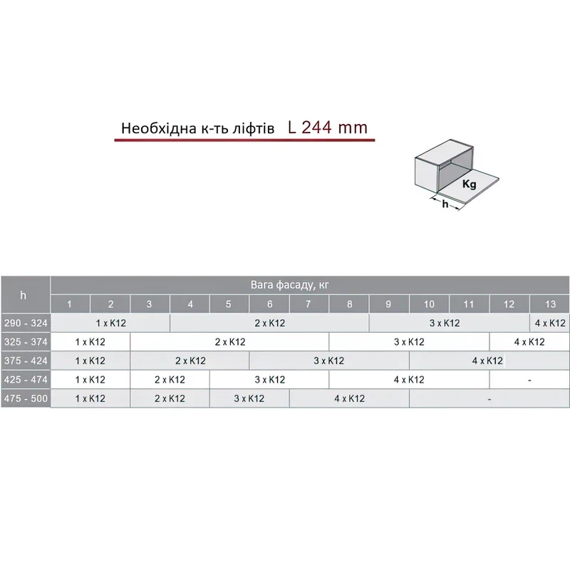 - Универсальность и легкость: Подъемник K12 оснащен универсальным «нулевым» усилием N, что позволяет ему быть использованным для дверей различных размеров и веса. Это делает систему универсальным решением для мебели любого типа.