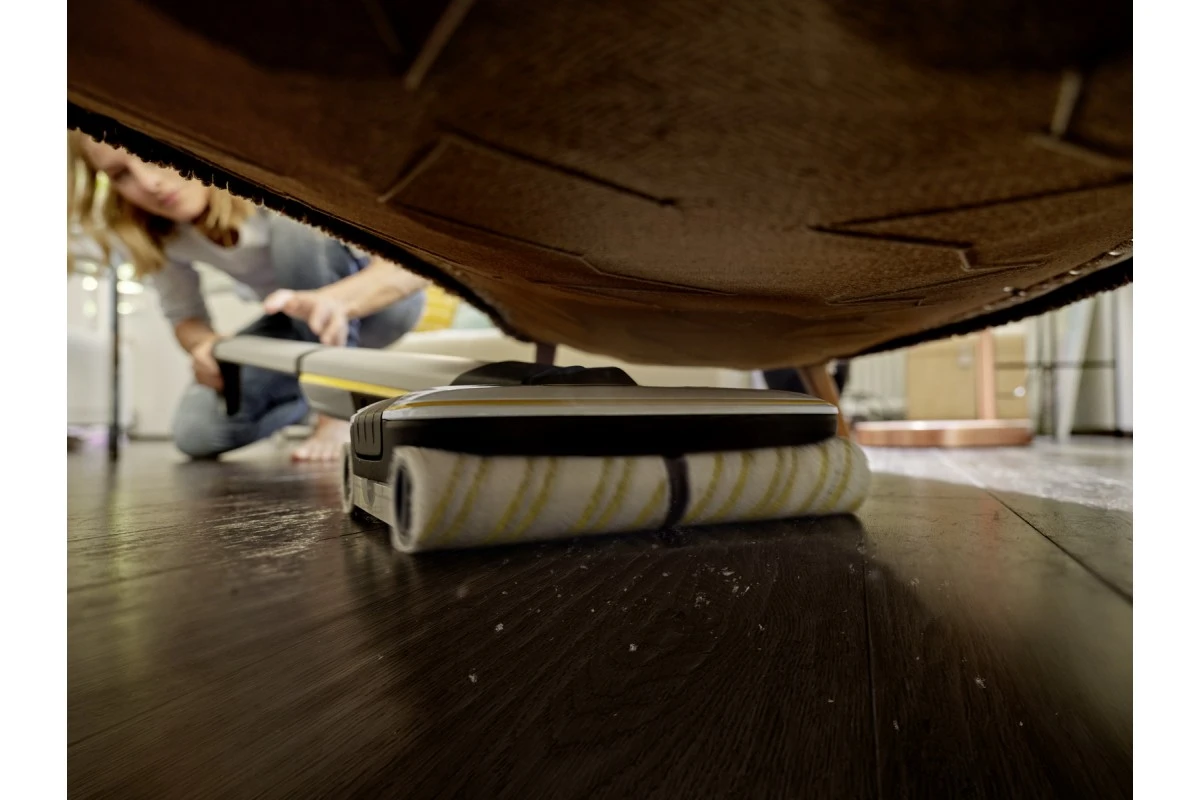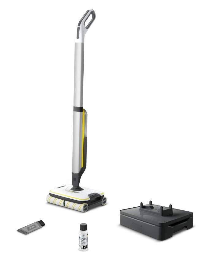 Завдяки технології 4 роликових щіток, що обертаються назустріч одна одній, акумуляторна електрошвабра Karcher FC 7 Cordless легко і швидко видаляє з будь-яких твердих підлогових покриттів будь-які повсякденні сухі та вологі забруднення. Апарат ретельно очищає підлогу до самих стін, причому режим Boost дає змогу усувати стійкий бруд, а спеціальний фільтр - збирати навіть волосся. При цьому досягається значна економія часу, а результат прибирання на 20% перевершує той, що забезпечується звичайною шваброю. Одного заряду потужного акумулятора достатньо для 45 хвилин роботи апарата. Витрата води і швидкість обертання щіток, що автоматично зволожуються, допускають регулювання (передбачено 2 режими прибирання), а окремі бачки для чистої та брудної води виключають необхідність у перенесенні відра з водою.