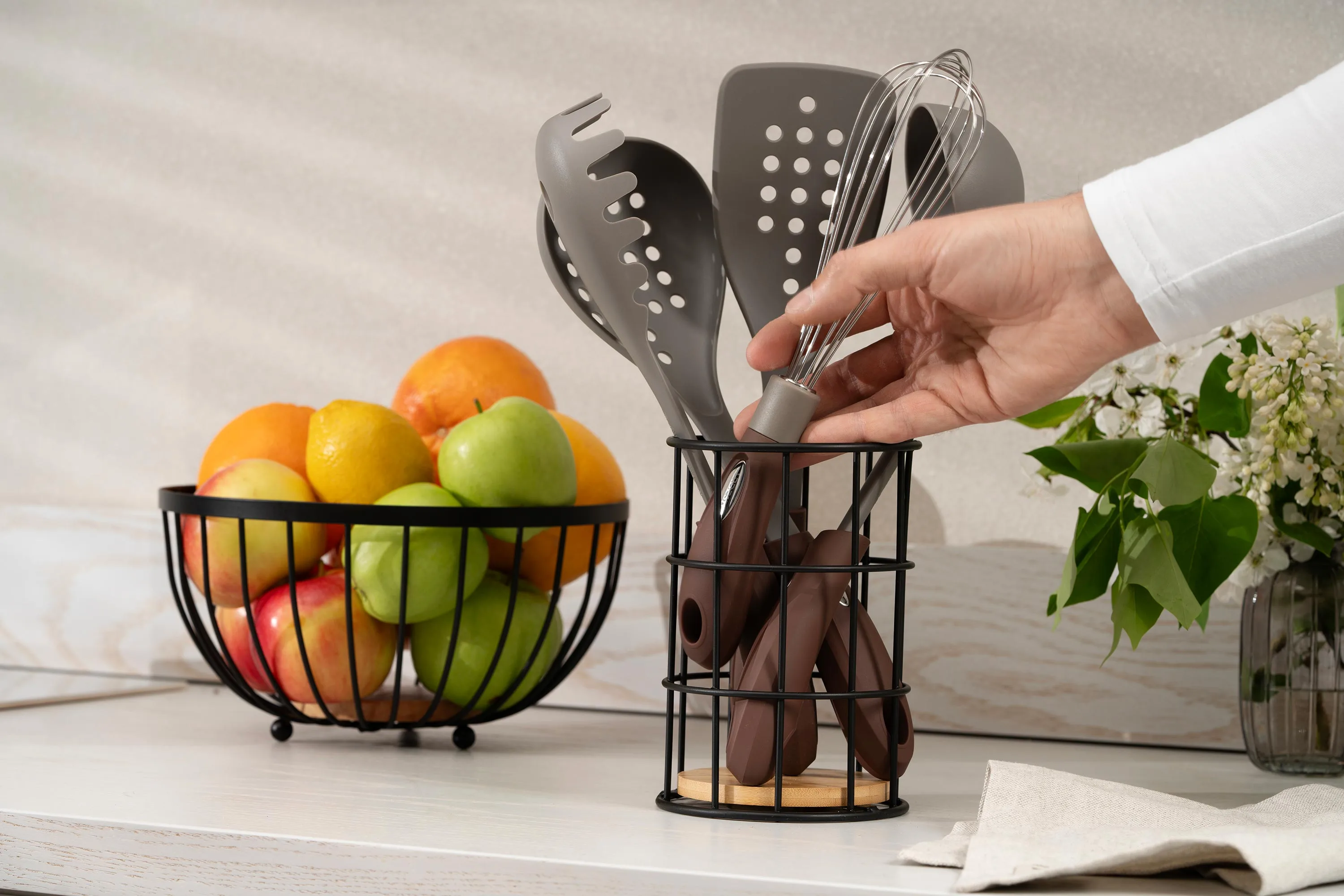 Підставка ARDESTO Midori допоможе організувати столові прибори та звільнити місце на стільниці. Конструкція виготовлена у стильному дизайні з металу чорного кольору та доповнена трендовою бамбуковою основою. Розмір 11 × 11 × 17 см робить підставку достатньо місткою, щоби зберігати всі столові прибори. Догляд за виробом нескладний, проте не передбачає миття в посудомийній машині.