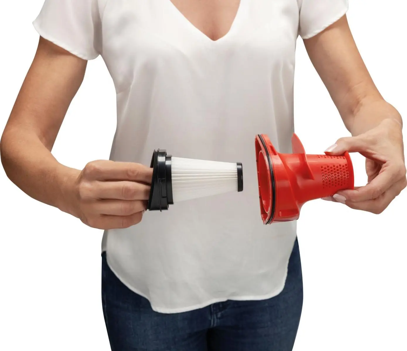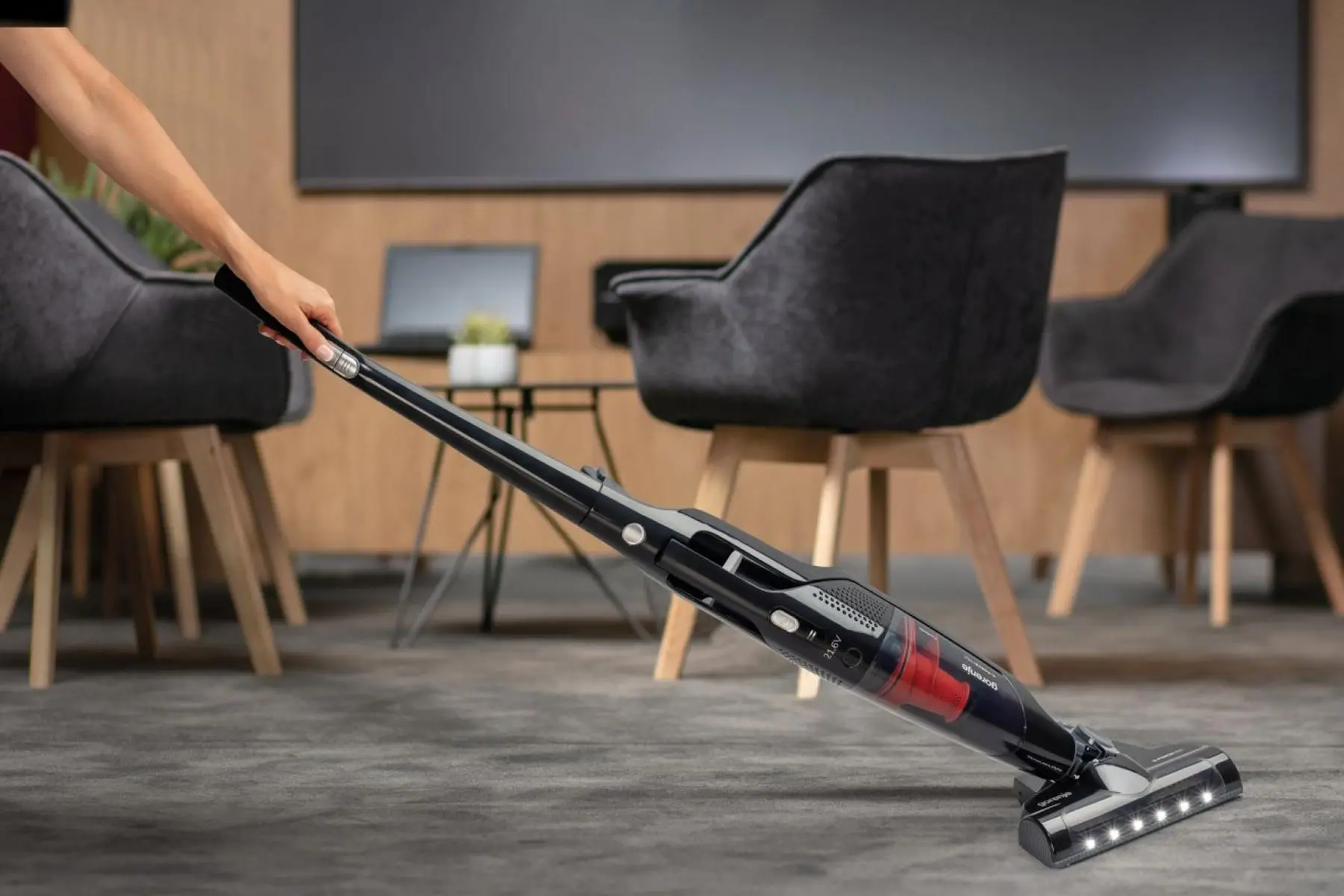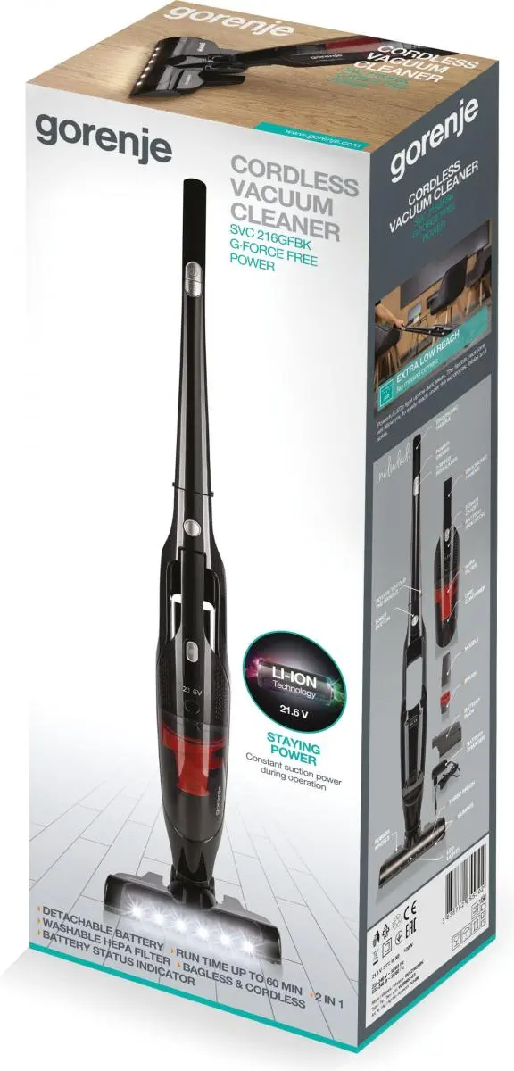 Пилосос Gorenje SVC216GFBK - це потужний прилад, який поєднує в собі переваги вертикального пилососа та портативного пристрою.  Він працює на літій-іонному акумуляторі, що забезпечує до 60 хвилин безперервного прибирання. Це залежить від налаштувань швидкості та типу підлоги. Технологічно вдосконалена турбощітка має широкий валик для кращого всмоктування. Після прибирання вийміть контейнер, відкрийте його і викиньте бруд. Фільтр HEPA можна промити та використовувати знову. Складна ручка дозволяє зберігати пилосос в невеликих місцях.
