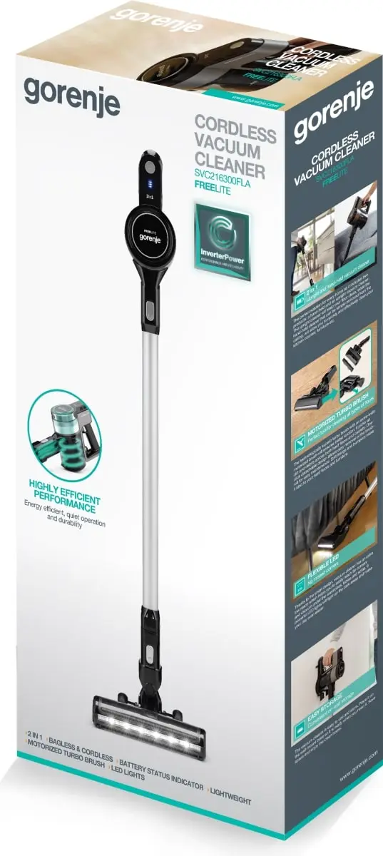 Пилосос Gorenje SVC216300FLA — бездротовий 2-в-1 пристрій із потужним інверторним двигуном і моторизованою турбощіткою, який легко перетворюється з вертикального на ручний. Оснащений гумовими колесами, LED-підсвіткою, індикатором заряду та зручною системою очищення пилозбірника. Ідеальний для прибирання будь-яких поверхонь, у тому числі паркету та важкодоступних зон.