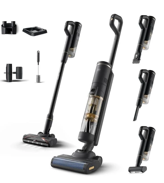 Philips AquaTrio — це багатофункціональний бездротовий пилосос 3-в-1 для сухого, вологого та ручного прибирання. Оснащений потужними щітками AquaSpin зі швидкістю 2500 об/хв, інтелектуальними режимами роботи, LED-підсвіткою для виявлення пилу, гнучкою конструкцією для прибирання під меблями та автоматичною системою очищення без потреби ручного миття. Ідеально підходить для щоденного догляду за підлогою, зокрема в оселях із домашніми тваринами.