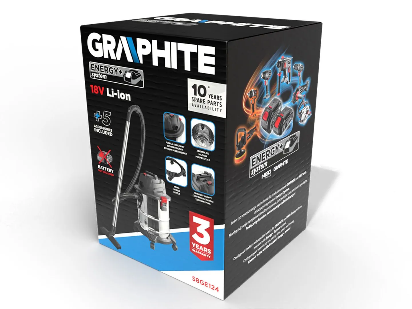 Акумуляторний пилосос для вологого та сухого прибирання GRAPHITE 58GE124 є частиною серії інструментів Energy+, що працюють від 18В Li-Ion акумуляторів. Цей універсальний пристрій призначений для прибирання як сухого сміття, так і рідин, забезпечуючи ефективну роботу в різних умовах.