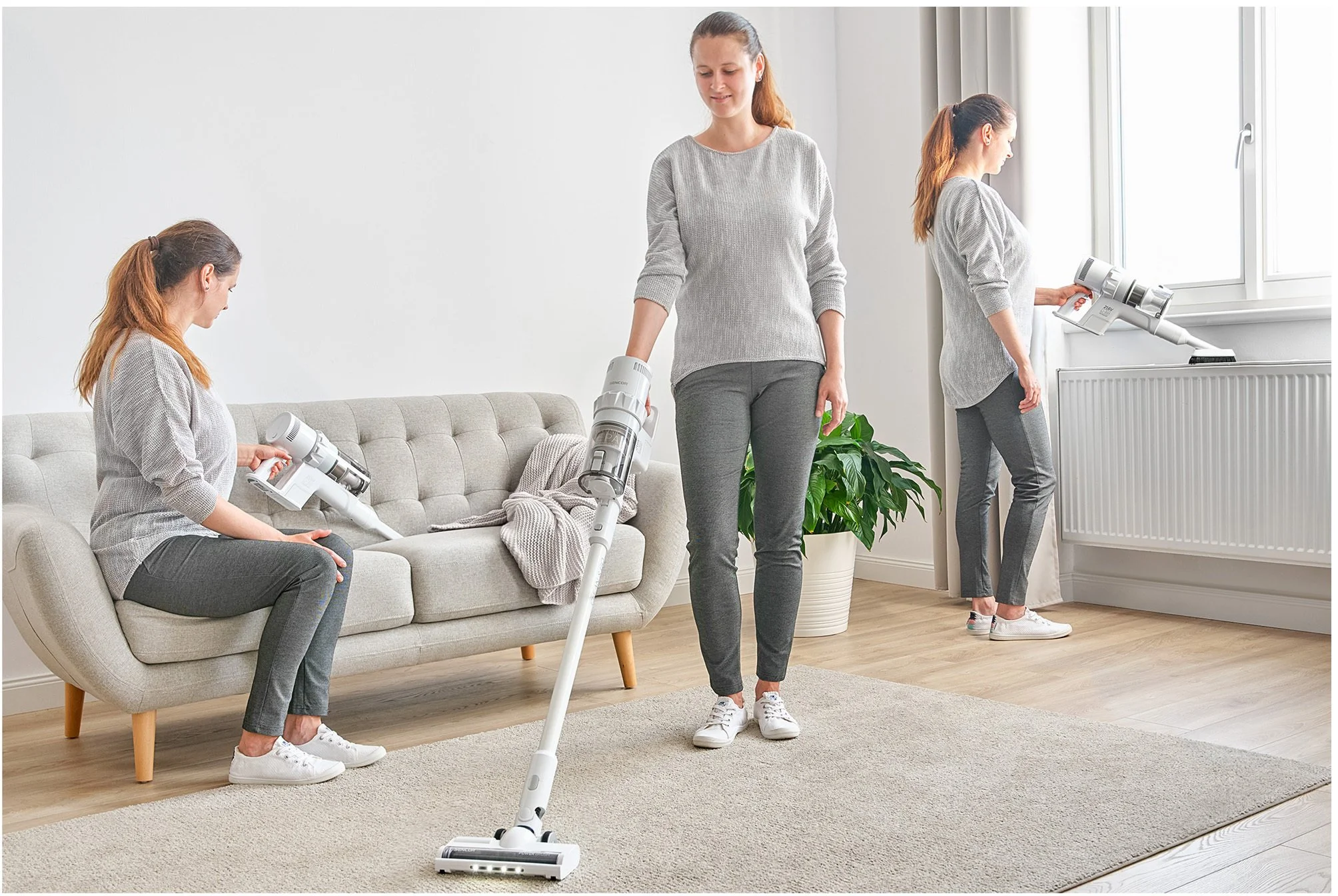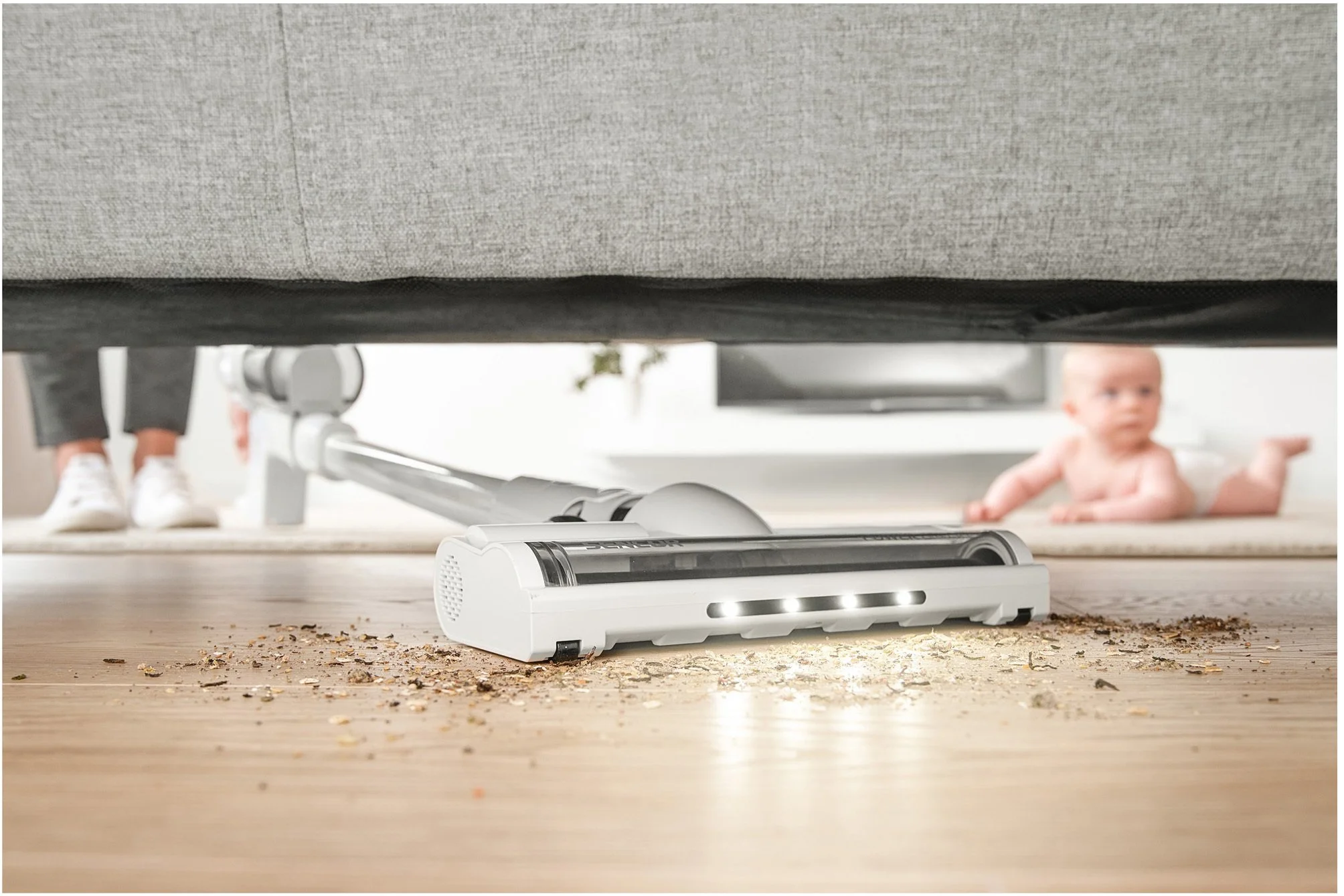 Акумуляторний вертикальний пилосос 2 в 1 - це чудовий помічник для простого та досконалого прибирання. Він обладнаний цифровим двигуном з потужністю 250 Вт, який гарантує відмінні результати прибирання для всіх типів поверхонь. Він легкий, з простим керуванням, і завдяки цьому можна виконувати прибирання у важкодоступних та високих місцях. Насадка зі світлодіодним освітленням допомагає легко виявити навіть незначний пил і спрощує прибирання в темних місцях.