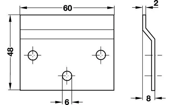 Навісна планка до підвісу для шаф, виготовлена з оцинкованої сталі. Монтаж планки виконується шляхом пригвинчування. Розміри навісної планки: довжина/висота/товщина/діаметр отворів - 60/48/2/6 мм.