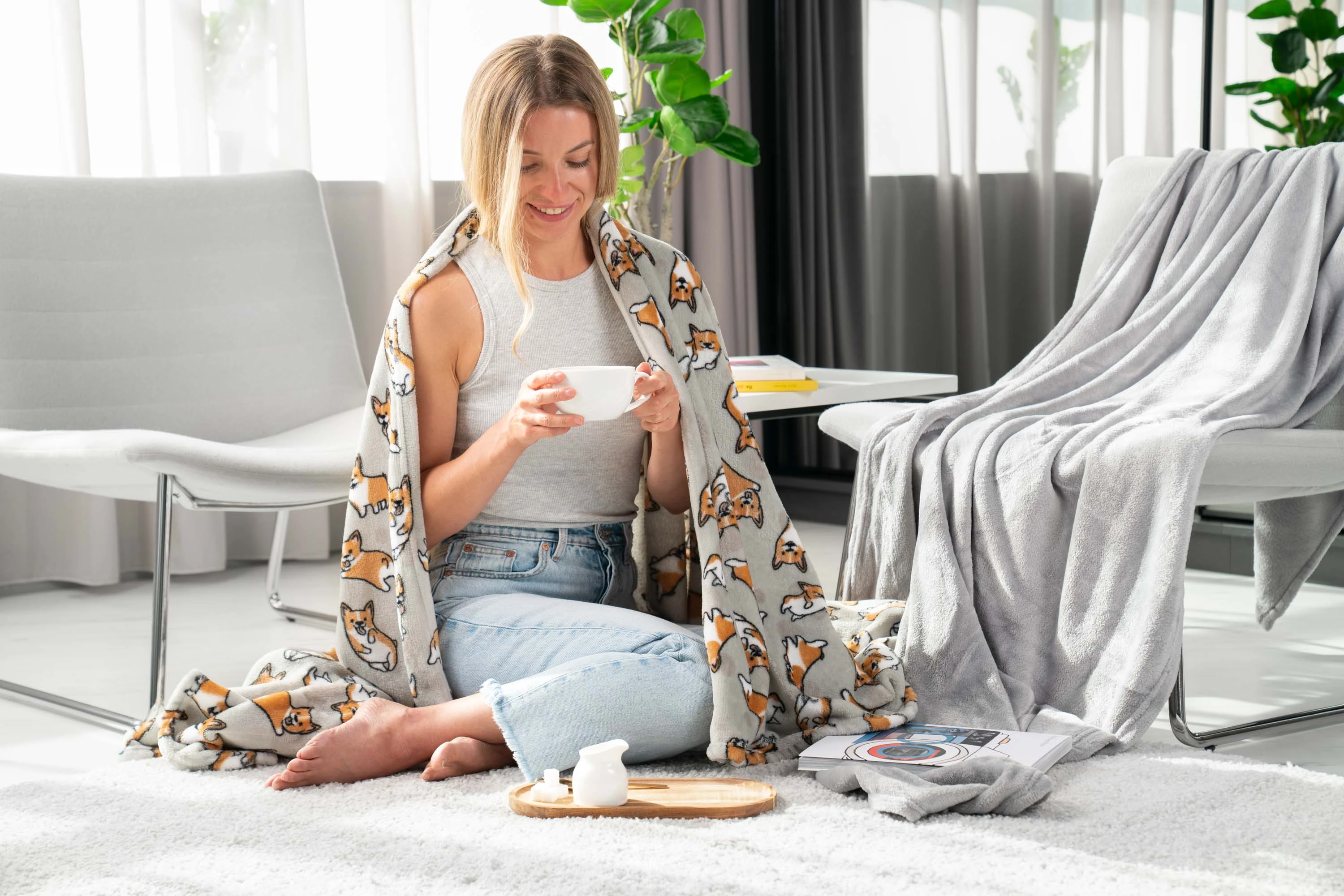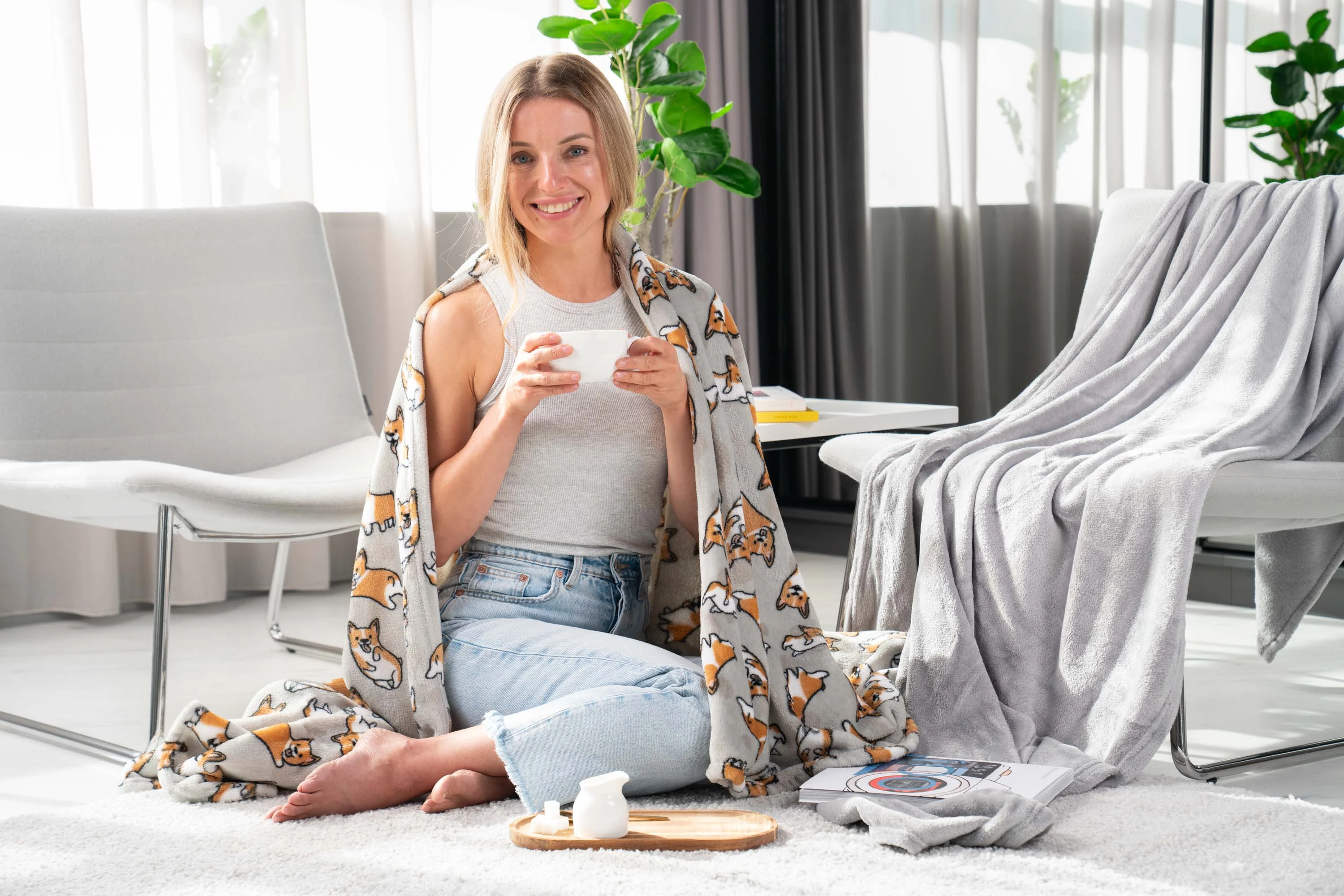 Колекція пледів Flannel виготовлена з високоякісної мікрофібри,шовковистої і приємної на дотик. Пледи дуже легкі і при тому надзвичайно теплі, по зберіганню теплоти конкуренту мікрофібрі важко знайти. Використовуйте як пухнасту накидку, ще один шар утеплення під час сну або як елемент декору.Пледи Flannel прості в догляді, не втрачають кольору і форми після прання, приноситимуть радість користування протягом тривалого часу. Милий дизайн з песиками коргі прийдеться до смаку малечі і бажаючим додати позитиву до оточення.