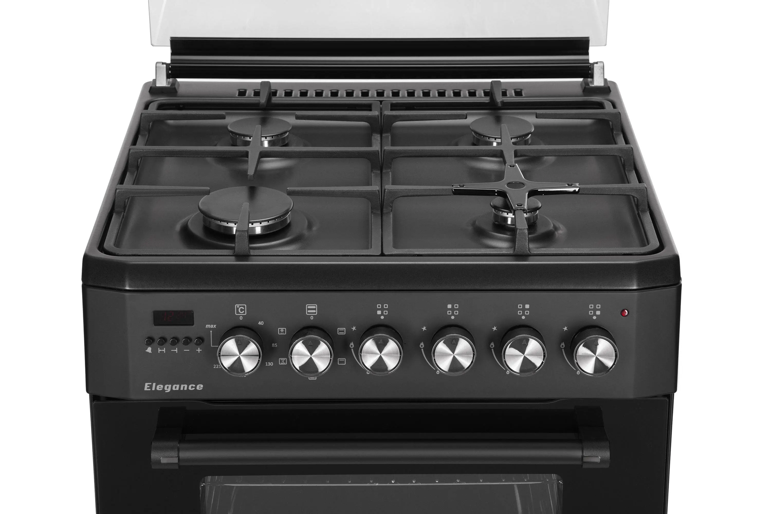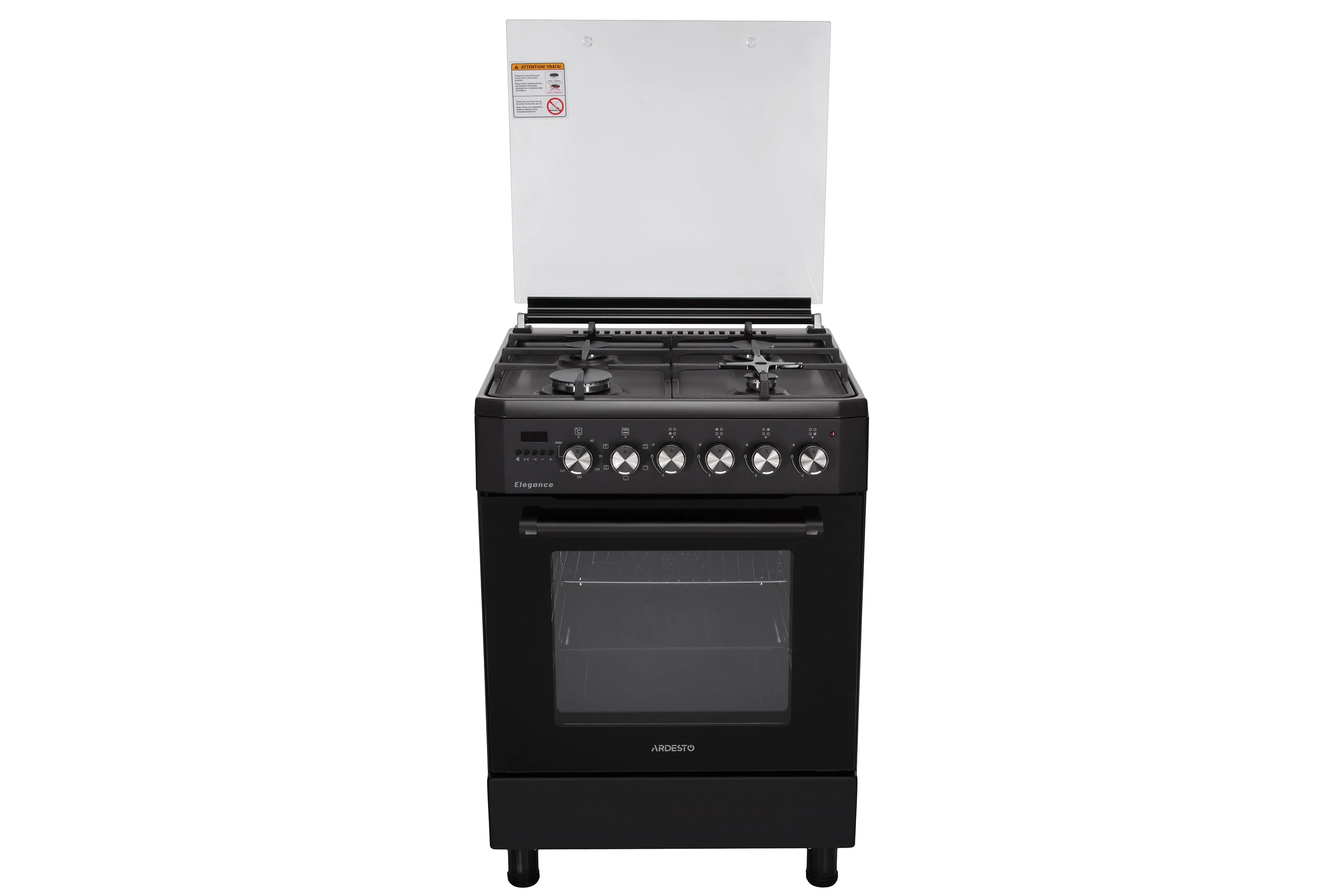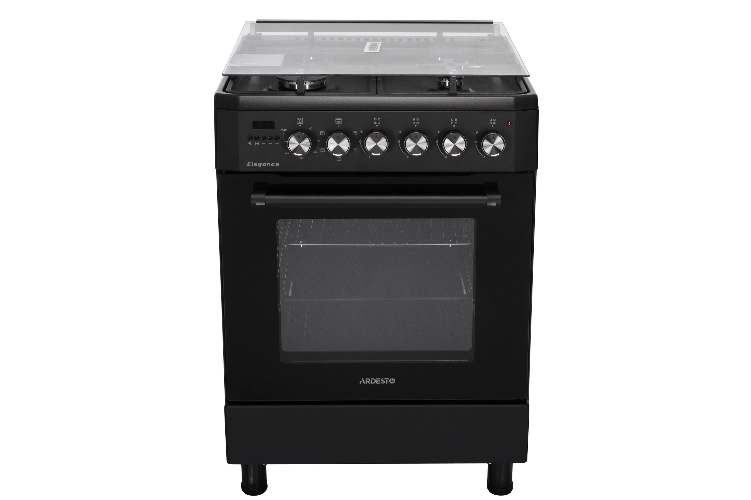 ARDESTO FSCF-C606MB — это функциональная и стильная **комбинированная плита серии Elegance**, сочетающая в себе **газовую варочную панель с чугунными решётками** и **электрическую духовку объёмом 66 литров**. Оснащена **конвекцией**, **подсветкой духовки** и **форсунками для подключения к баллонному газу (LPG)**. Выполнена в элегантном **матовом чёрном цвете**, который прекрасно дополняет современный интерьер кухни.