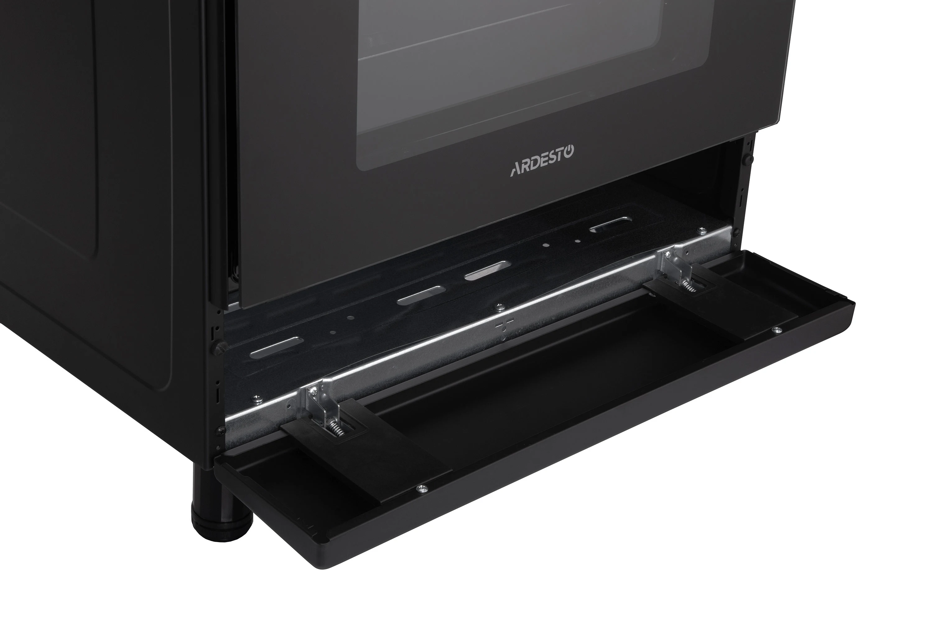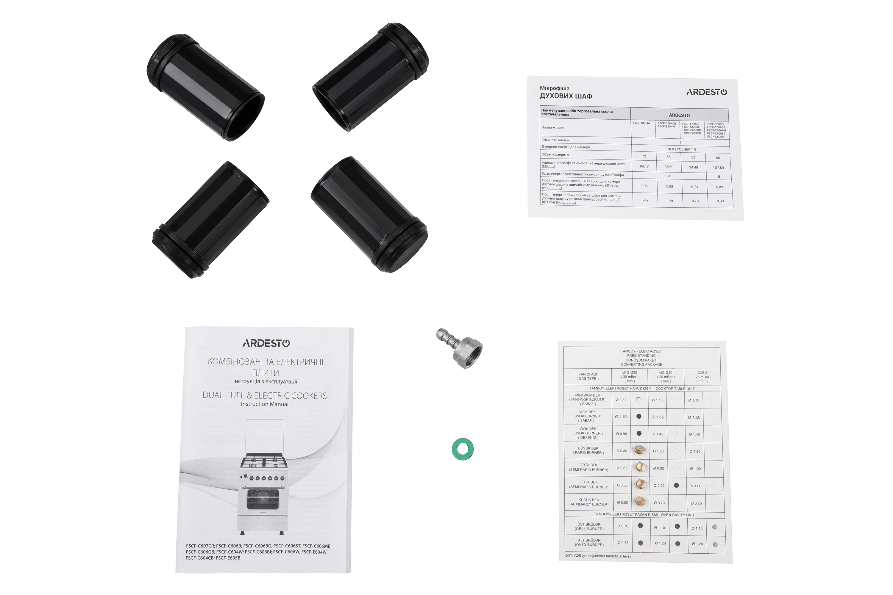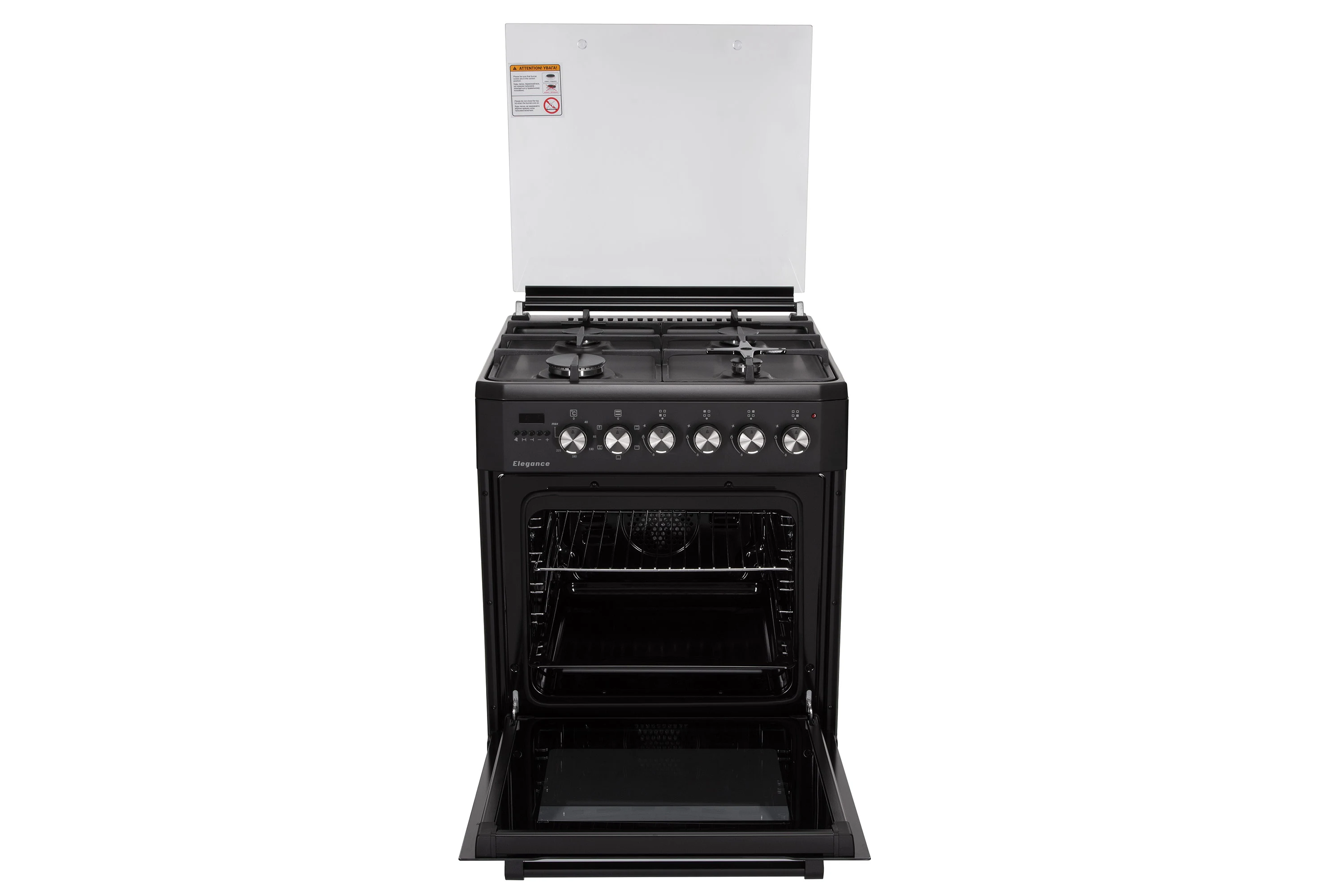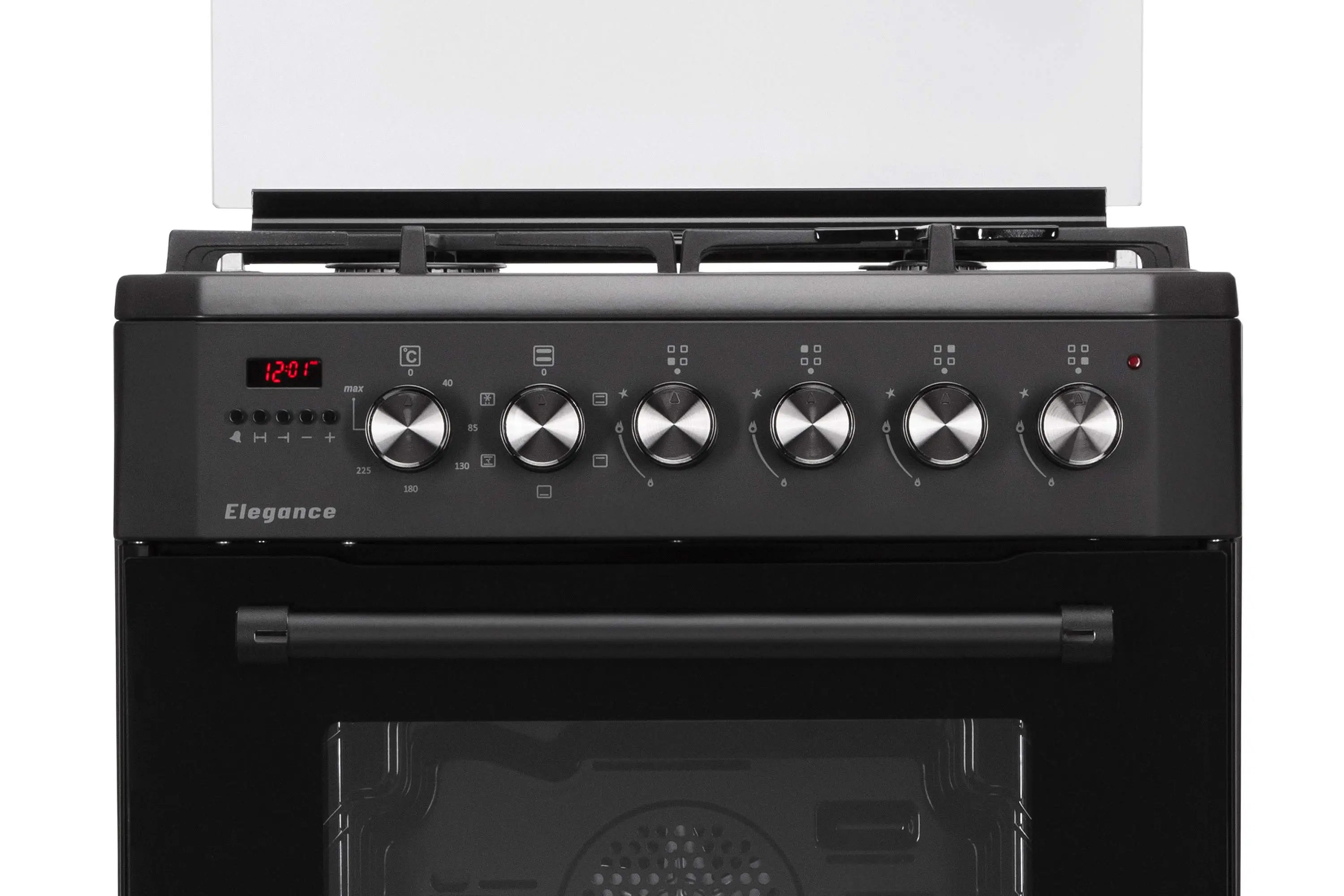 ARDESTO FSCF-C606MB — это функциональная и стильная **комбинированная плита серии Elegance**, сочетающая в себе **газовую варочную панель с чугунными решётками** и **электрическую духовку объёмом 66 литров**. Оснащена **конвекцией**, **подсветкой духовки** и **форсунками для подключения к баллонному газу (LPG)**. Выполнена в элегантном **матовом чёрном цвете**, который прекрасно дополняет современный интерьер кухни.