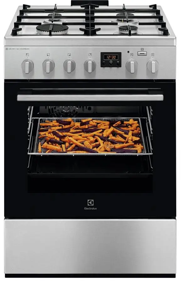 Electrolux LKK660220X — это современная **комбинированная плита** с **газовой варочной панелью** и **электрической духовкой объёмом 58 литров**, оснащённой **функцией пара**, **конвекцией**, **дисплеем** и **чугунными решётками**. Корпус из **нержавеющей стали** придаёт устройству стильный и профессиональный вид.