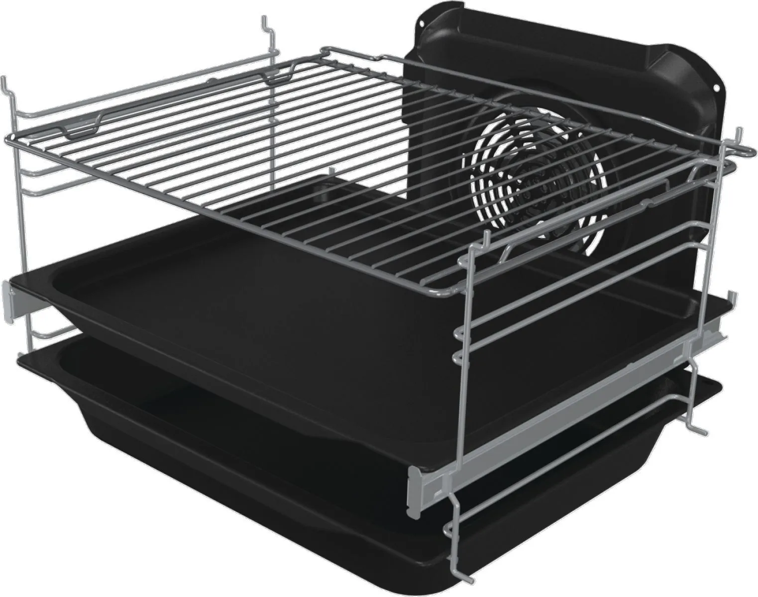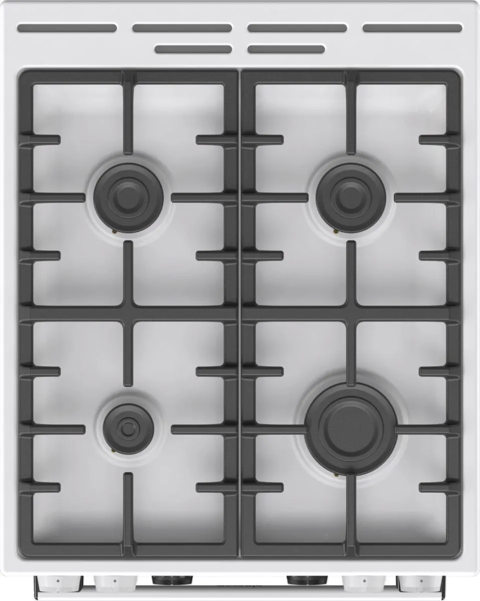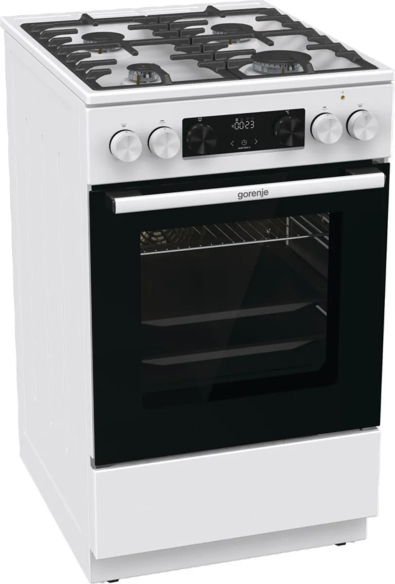 Комбінована плита Gorenje (50×60 см, біла) поєднує у собі газову варильну поверхню з чавунними решітками та багатофункціональну електричну духовку об'ємом 70 л. Оснащена електронним програматором IconLed, системою очищення парою AquaClean, телескопічними напрямними та плавним закриттям дверцят SoftClose.