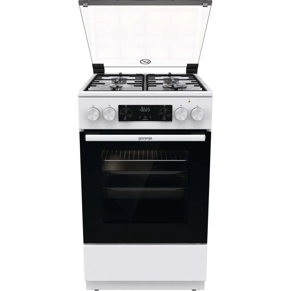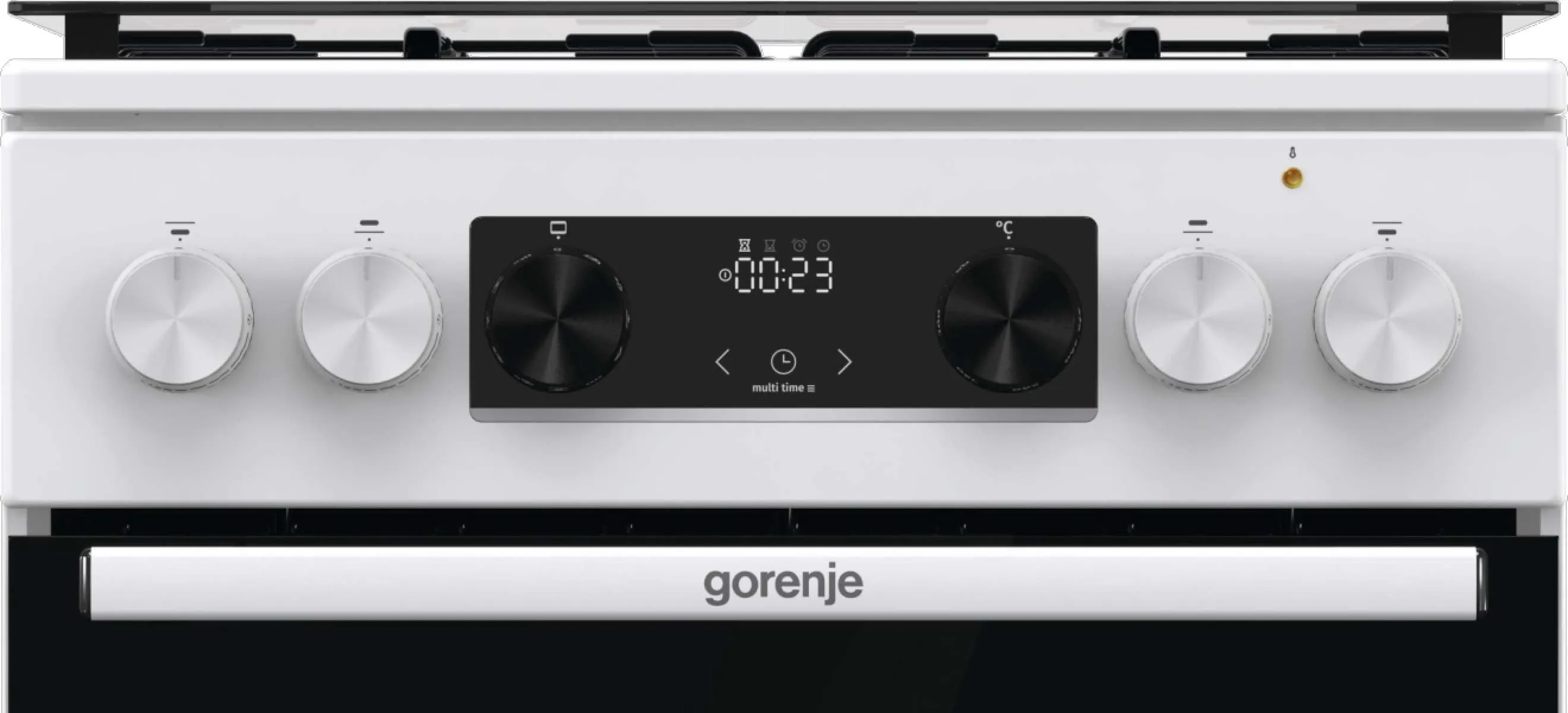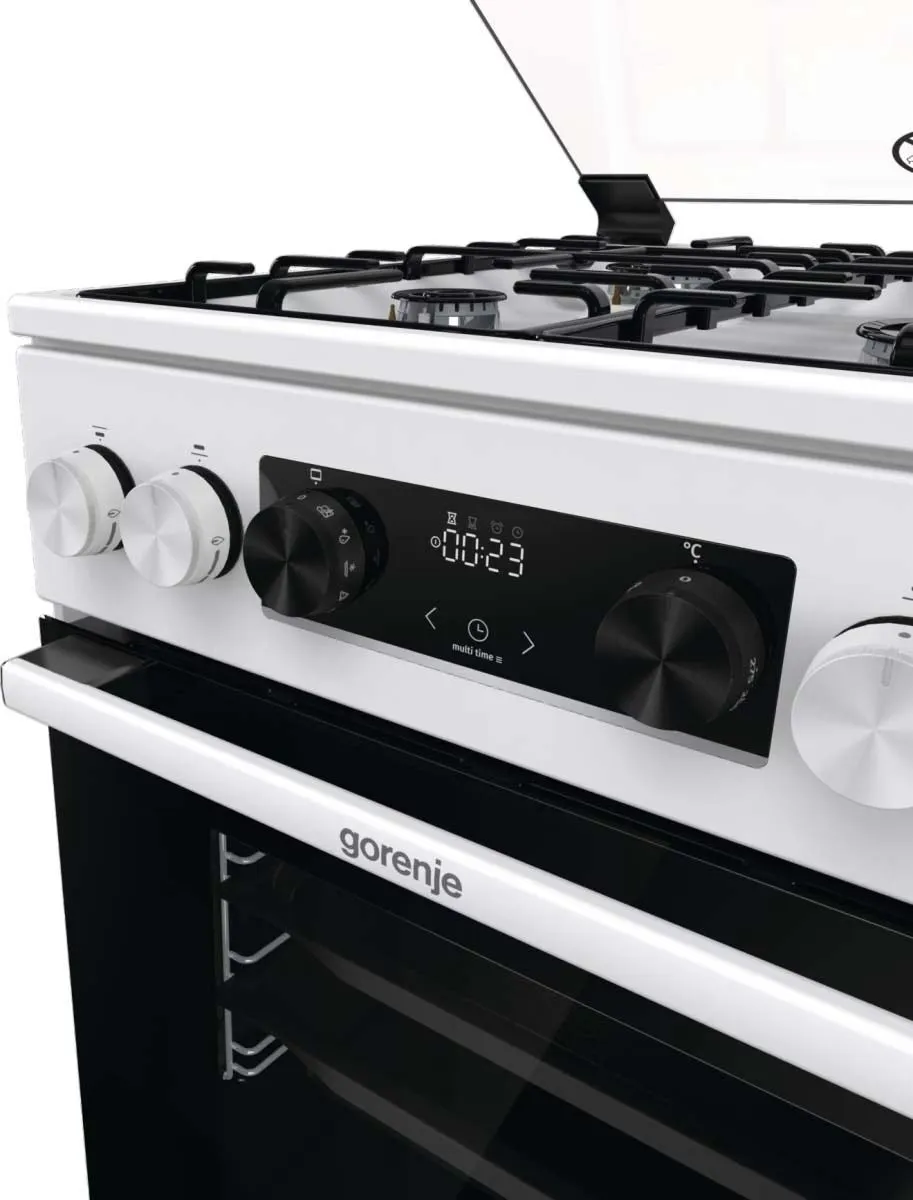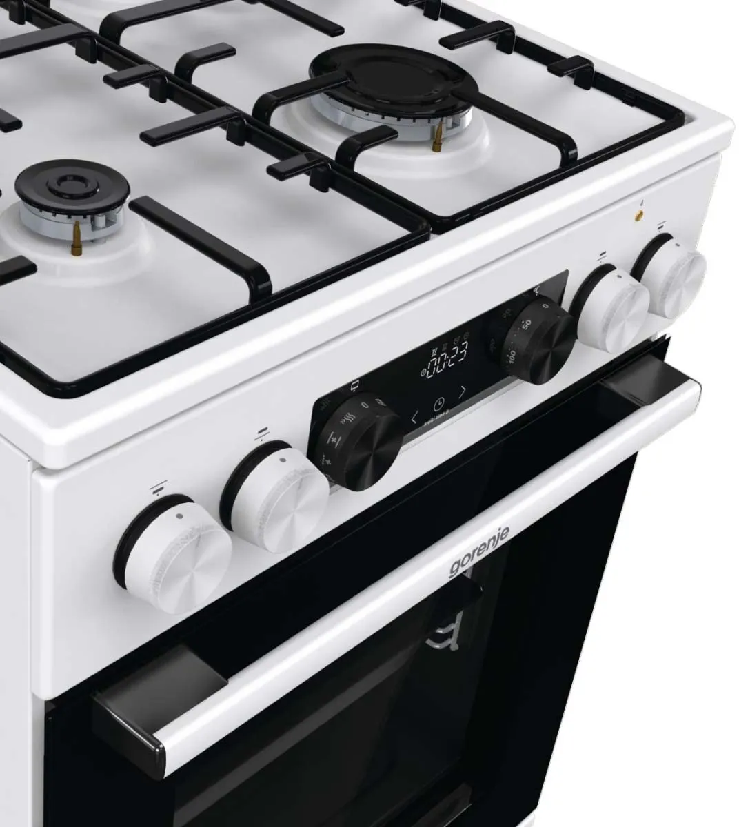 Gorenje MEKS5121W — это практичная комбинированная плита с **газовой варочной панелью** и **электрической духовкой объёмом 70 литров**. Оснащена **электронным таймером IconLed**, **эмалированными решётками**, а также **откидной стеклянной крышкой**, что делает её удобной и безопасной для ежедневного использования.
