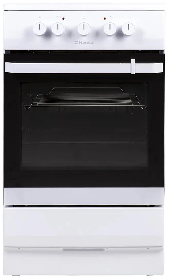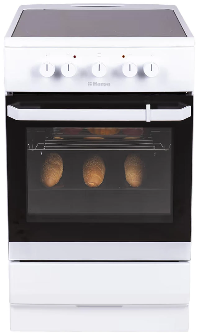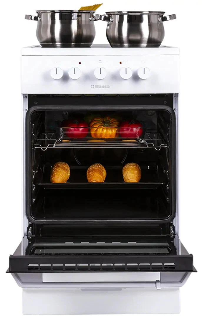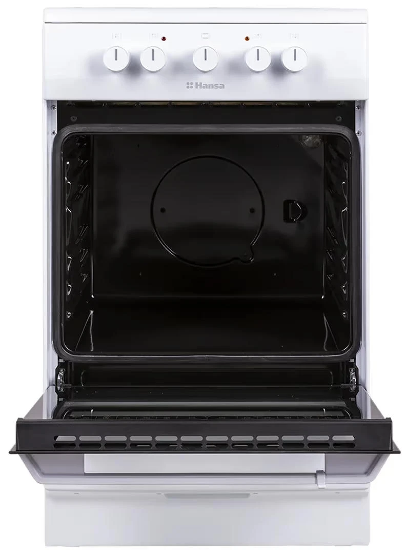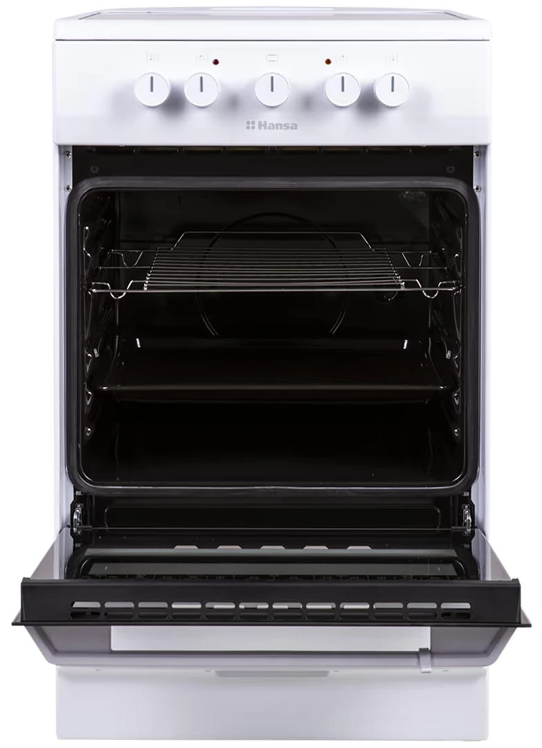 Електрична плита Hansa FCEW53000 з духовкою об’ємом 69 л та трьома функціями приготування. Має емаль легкого очищення, підсвітку, рецепти на дверцятах, металеву кришку та висувний ящик для посуду.
