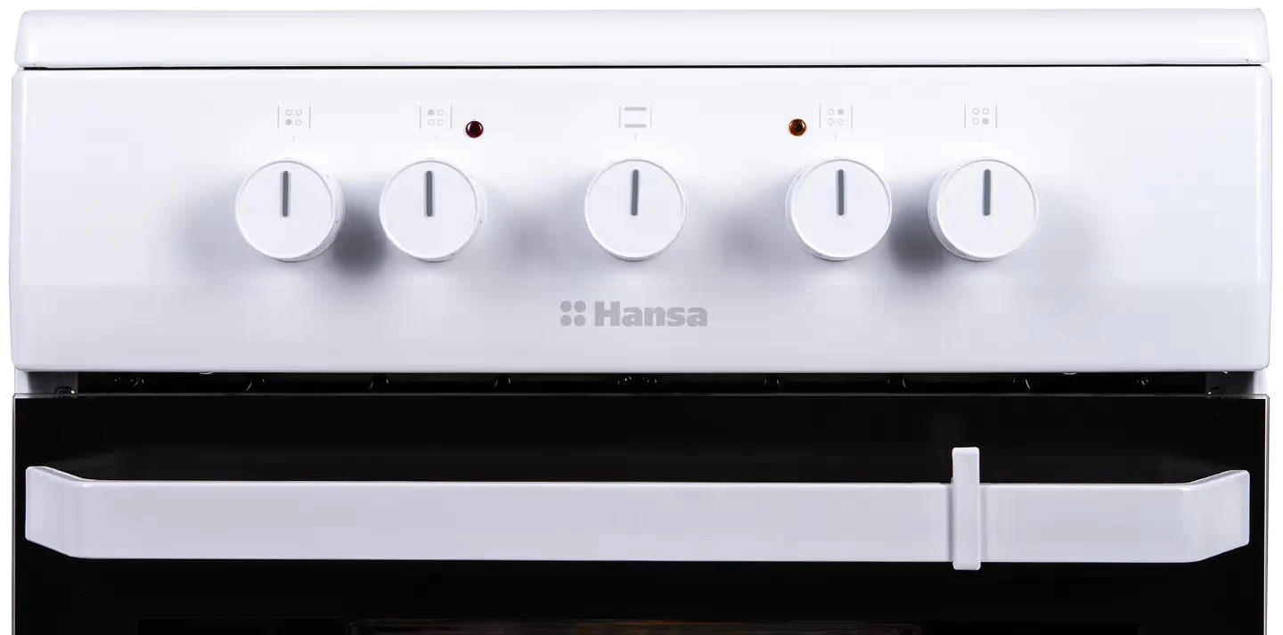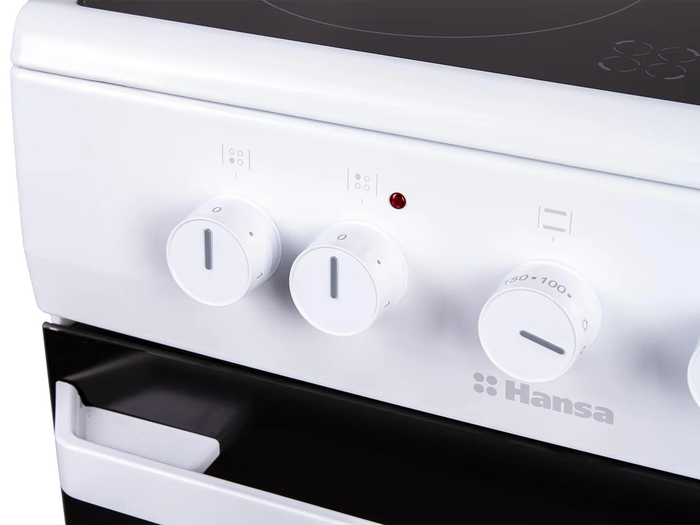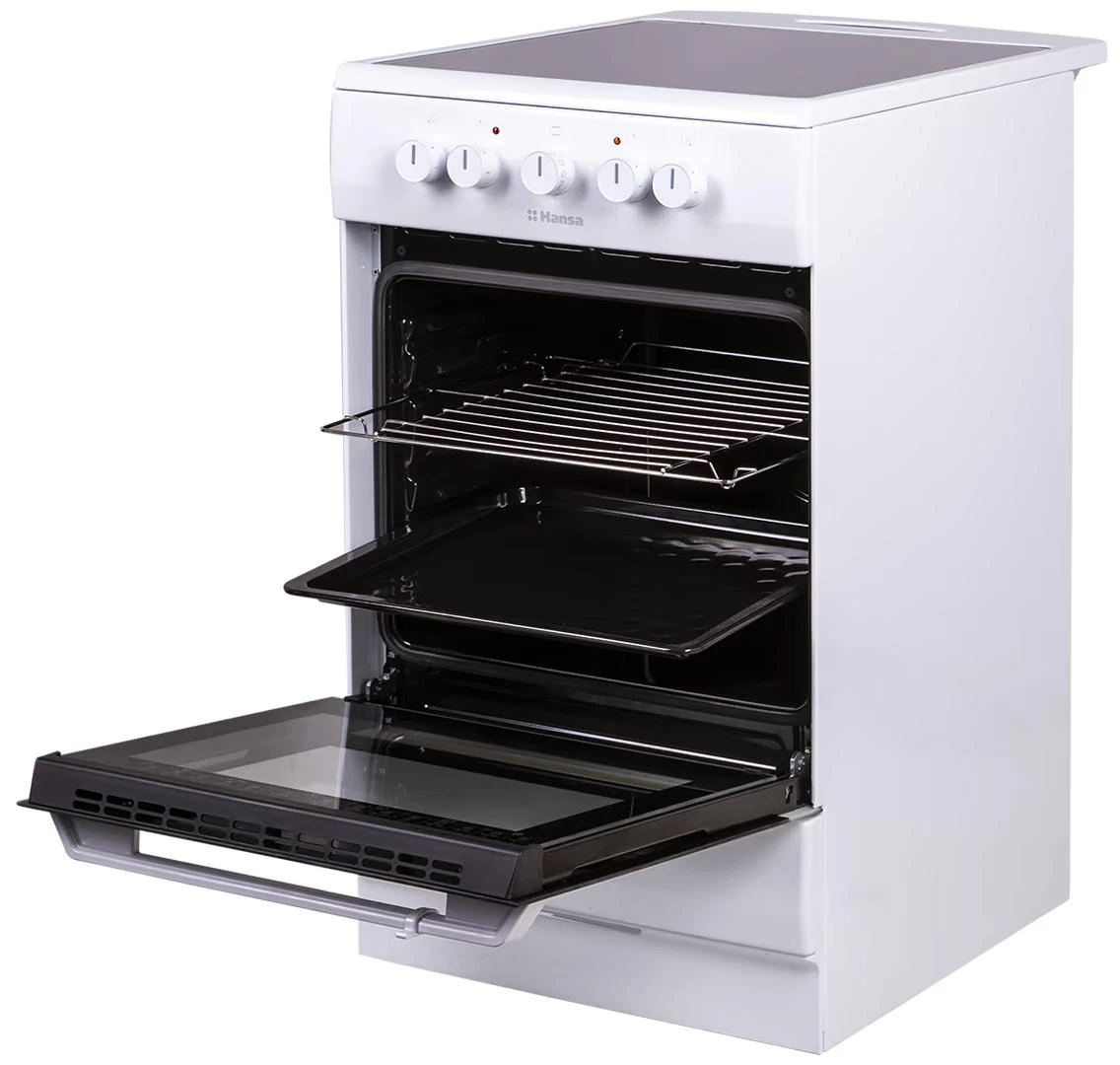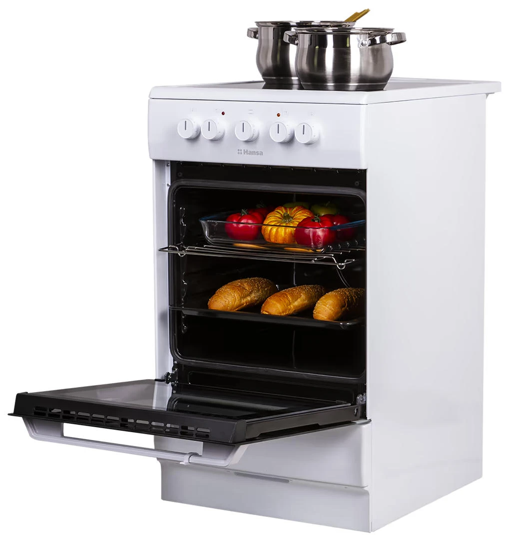 Електрична плита Hansa FCEW53000 з духовкою об’ємом 69 л та трьома функціями приготування. Має емаль легкого очищення, підсвітку, рецепти на дверцятах, металеву кришку та висувний ящик для посуду.