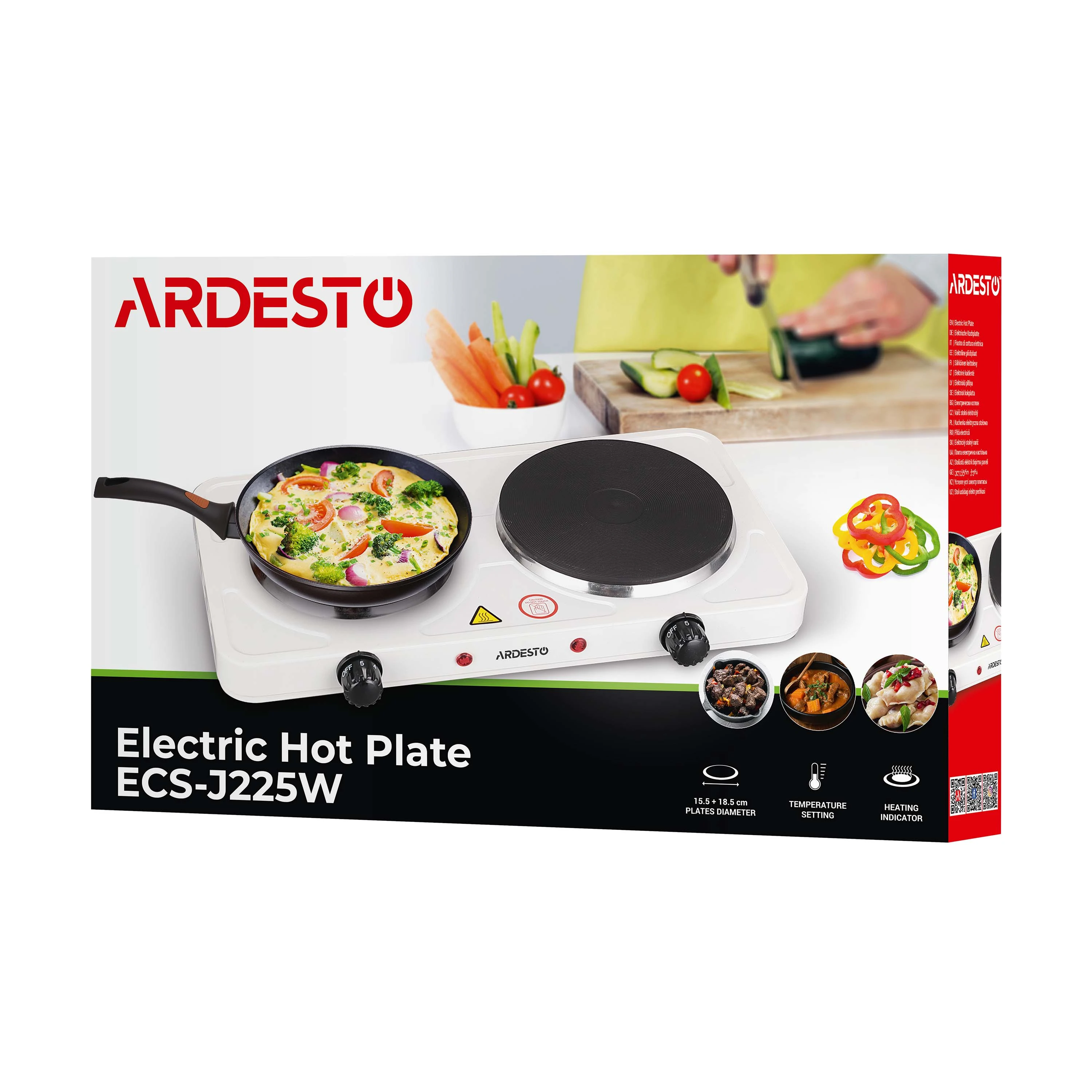 Електрична плита ECS-J225W білого кольору з двома конфорками діаметром 15,5 і 18,5 см й індикатором нагріву. Потужність однієї конфорки – 1 000 Вт, іншої – 1 500 Вт. Чудово підійде для приготування різноманітних страв вдома, на дачі, в гуртожитку, в умовах кемпінгу тощо. Є захист від перепадів напруги в електромережі й регулятор температури має п’ять положень нагріву. Загальна потужність становить 2 500 Вт, напруга – 220 – 240 В. Корпус виготовлено із емальованої сталі. Легка в налаштуванні, користуванні й догляді.